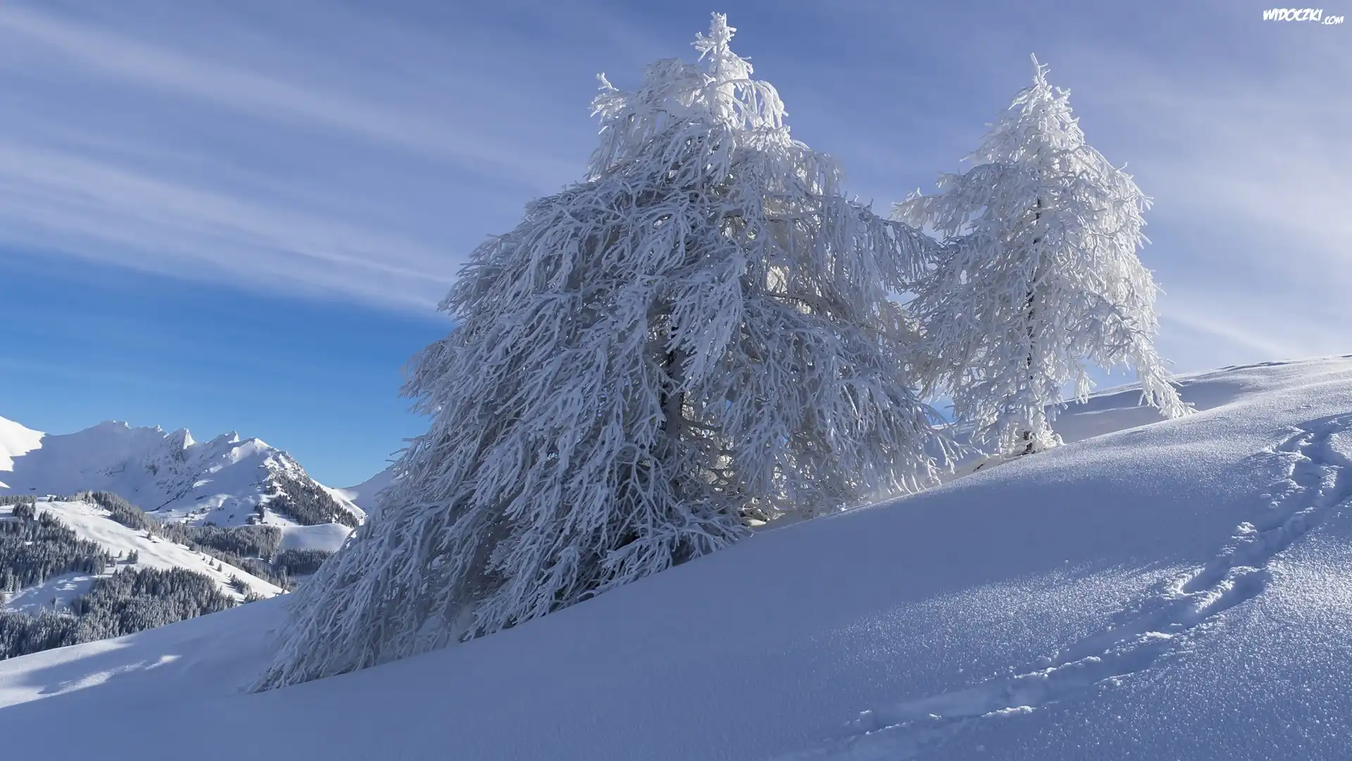 Zima, Góry, Ośnieżone, Drzewa, Ślady