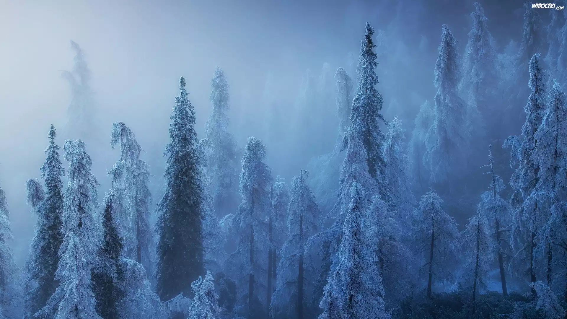 Zima, Las, Ośnieżone, Oszronione, Drzewa, Mgła