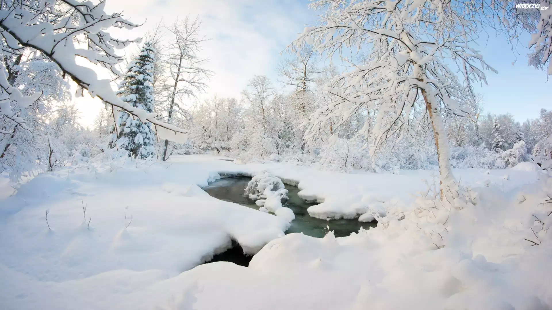 Zima, Rzeka, Ośnieżone, Drzewa, Chmury
