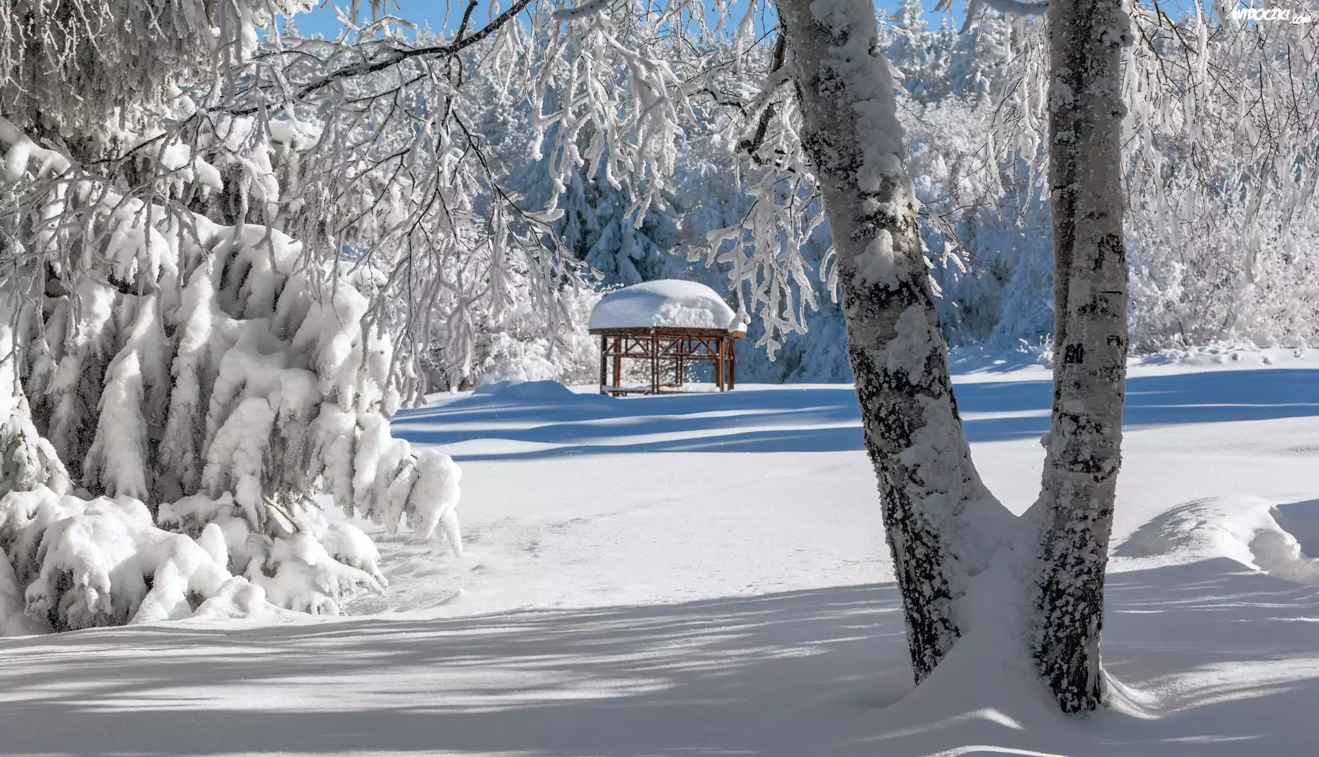 Zima, Śnieg, park, Drzewa, Altanka