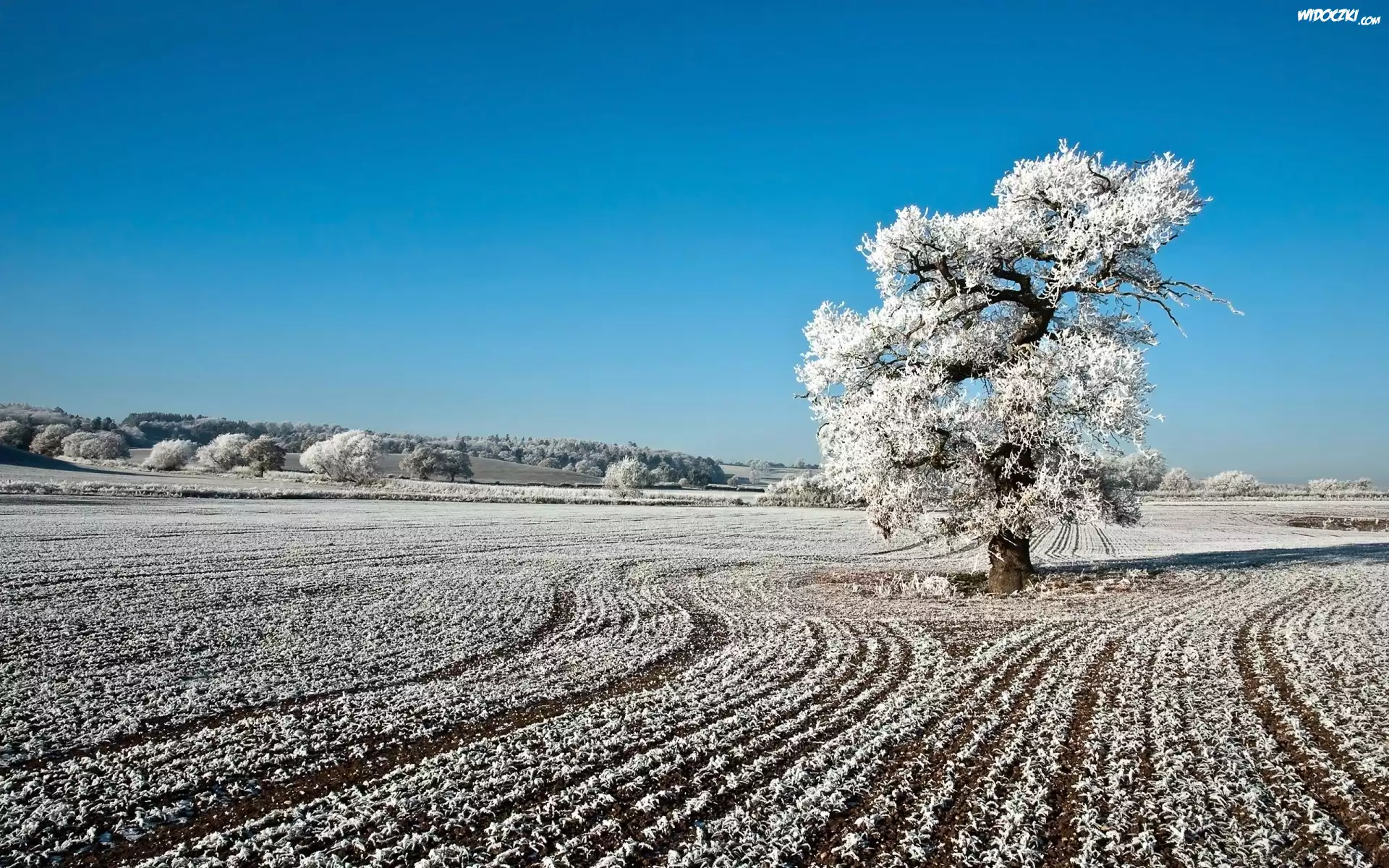 Zdjęcia, Zima, Pola, Drzewa, Niebo