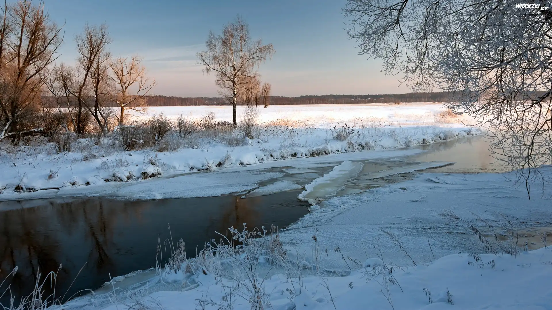 Zdjęcia, Zima, Rzeka, Rośliny, Drzewa, Pole