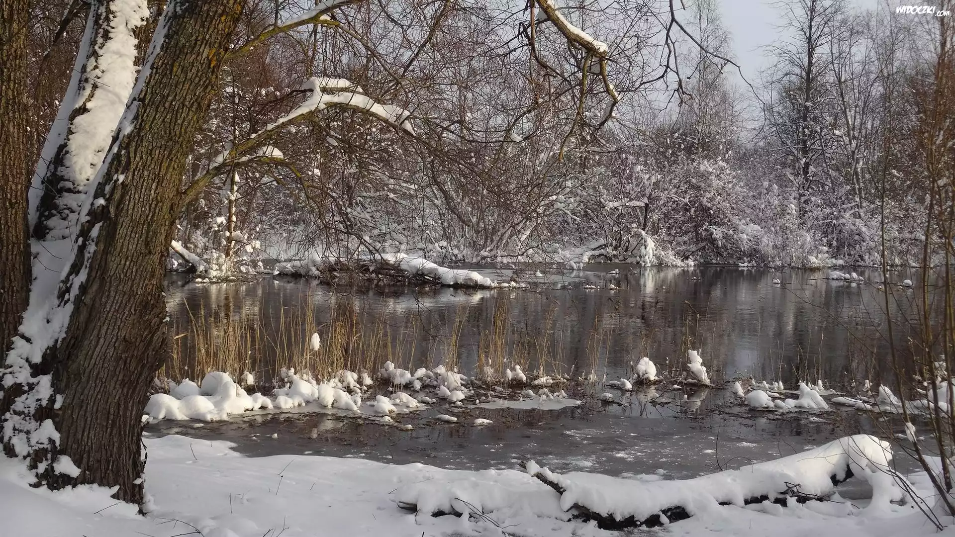 Zima, Śnieg, Rzeka, Drzewa, Trawa