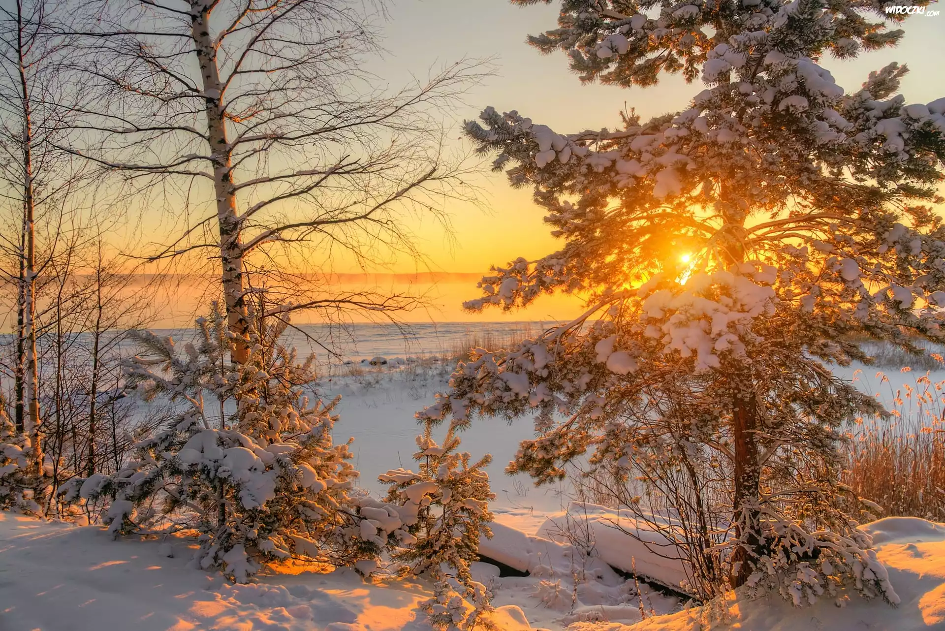 Zdjęcia, Zima, Wschód słońca, Drzewa, Pola