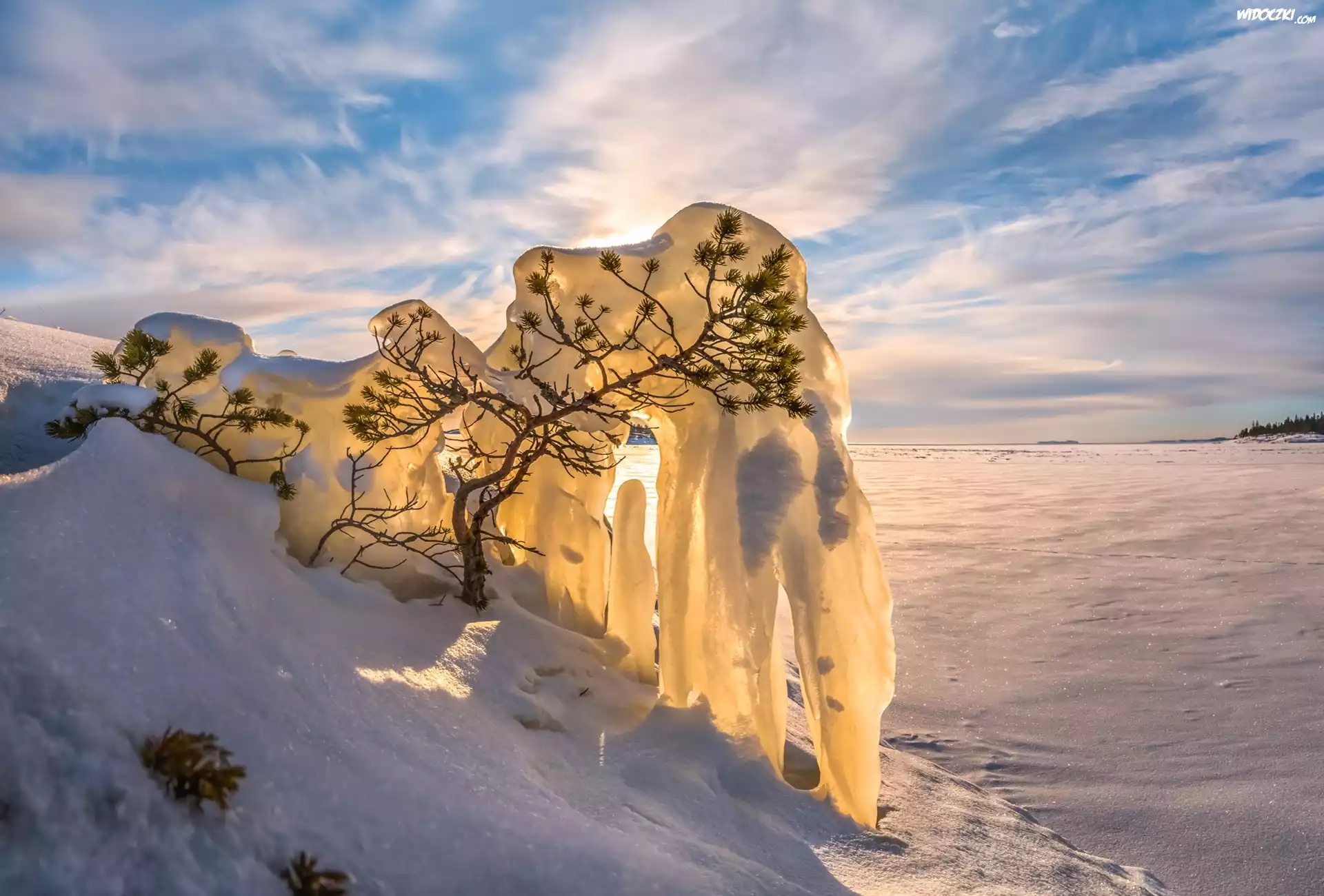 Zima, Ośnieżone, Oblodzone, Drzewko, Wschód słońca, Chmury, Zaśniezone, Jezioro Ładoga, Republika Karelii, Rosja |
