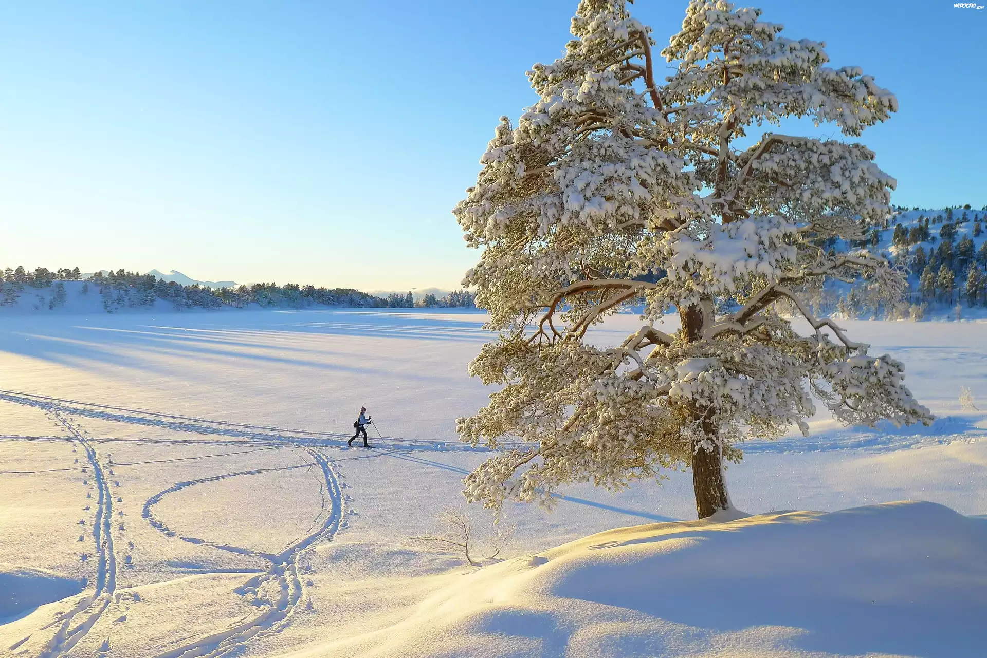 Zima, Śnieg, Drzewo, Człowiek