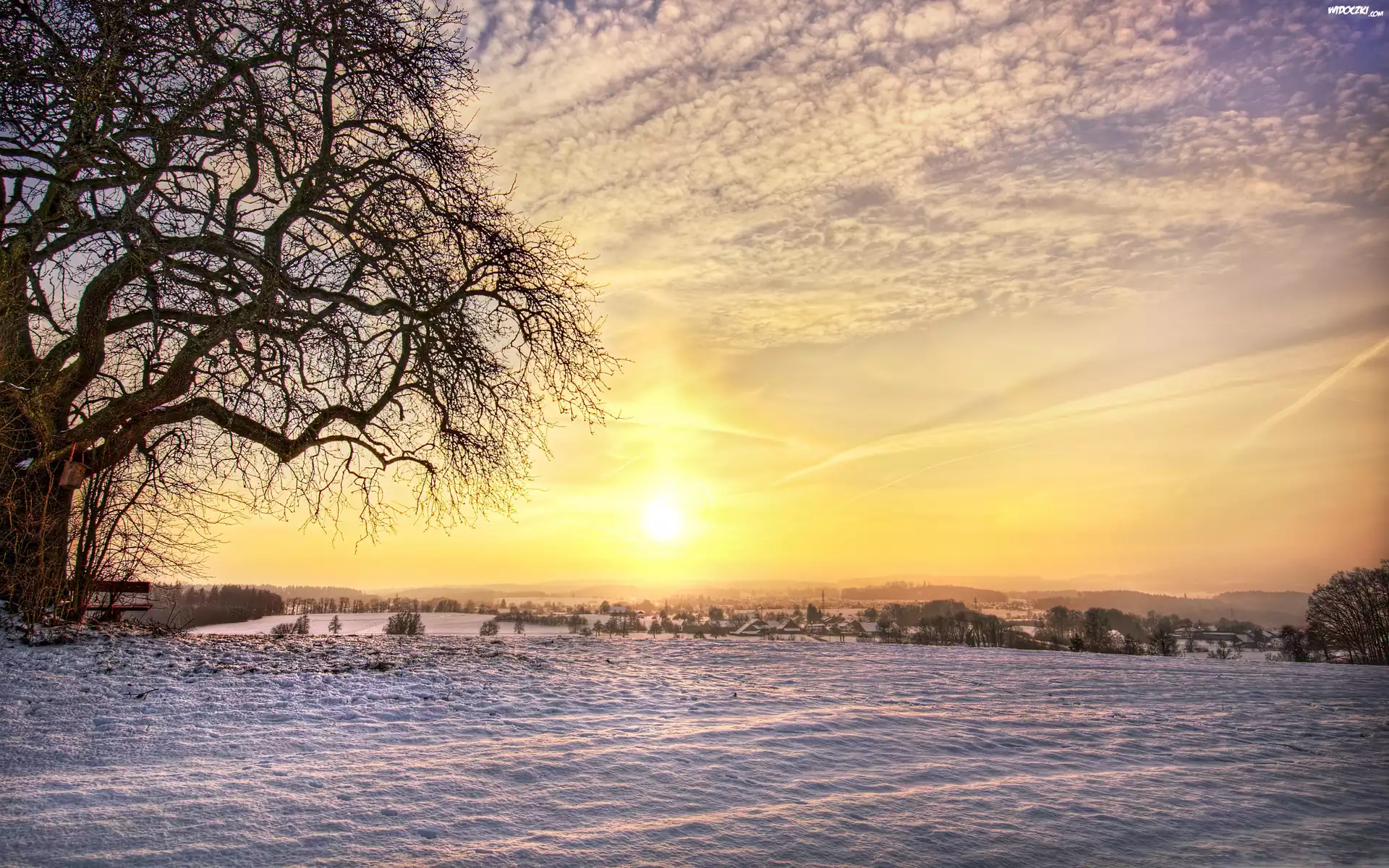 Zima, Wschód słońca, Drzewo, Ławka