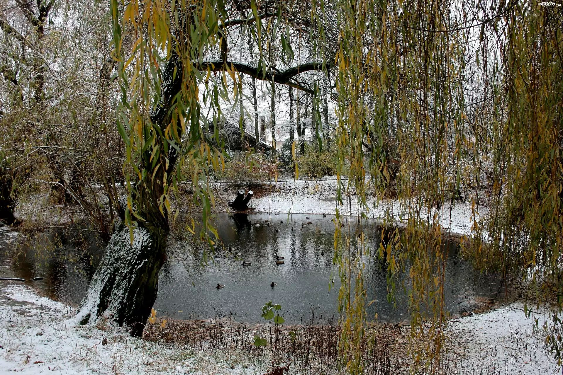Zdjęcia, Zima, Staw, Drzewo, Kaczki