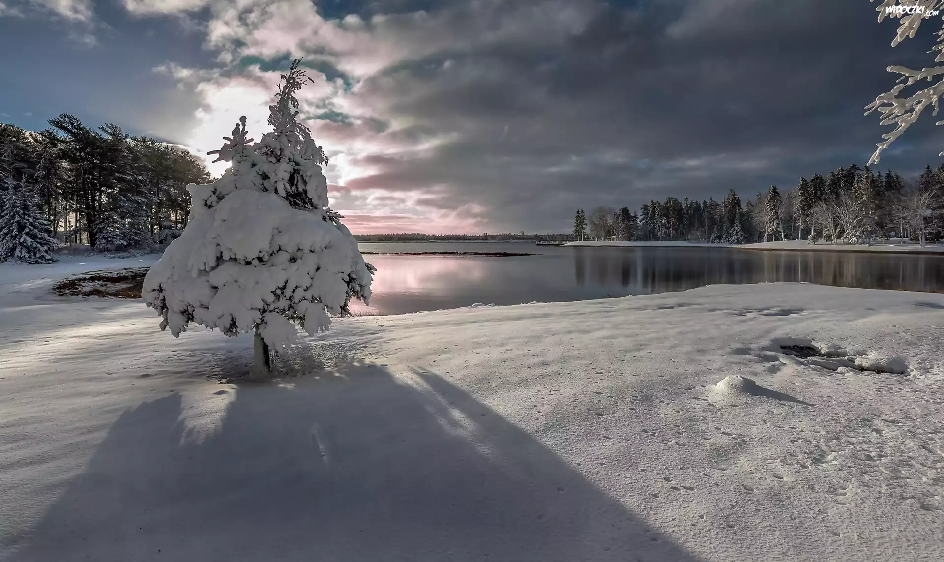 Zima, Jezioro, Wschód Słońca, Drzewo, Cień