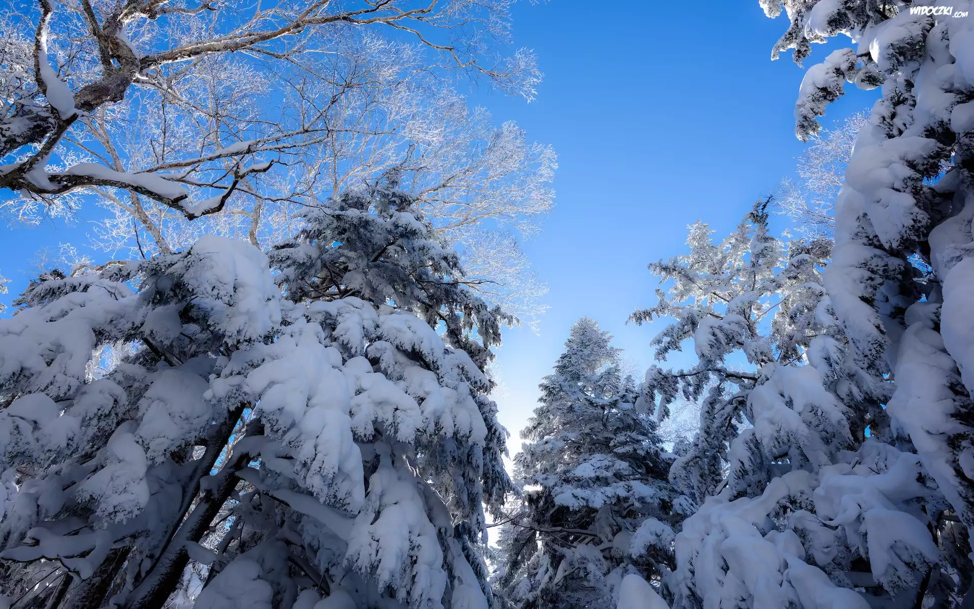 Zdjęcia, Zima, Drzewa, Wierzchołki, Ośnieżone, Gałęzie, Niebo