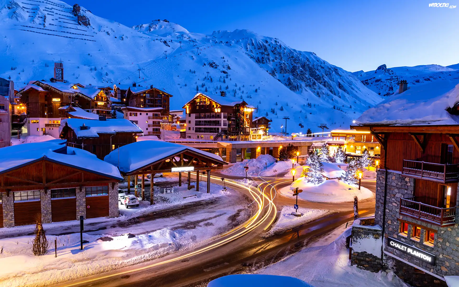 Zdjęcia, Zima, Domy, Góry, Latarnie, Góry, Ulica