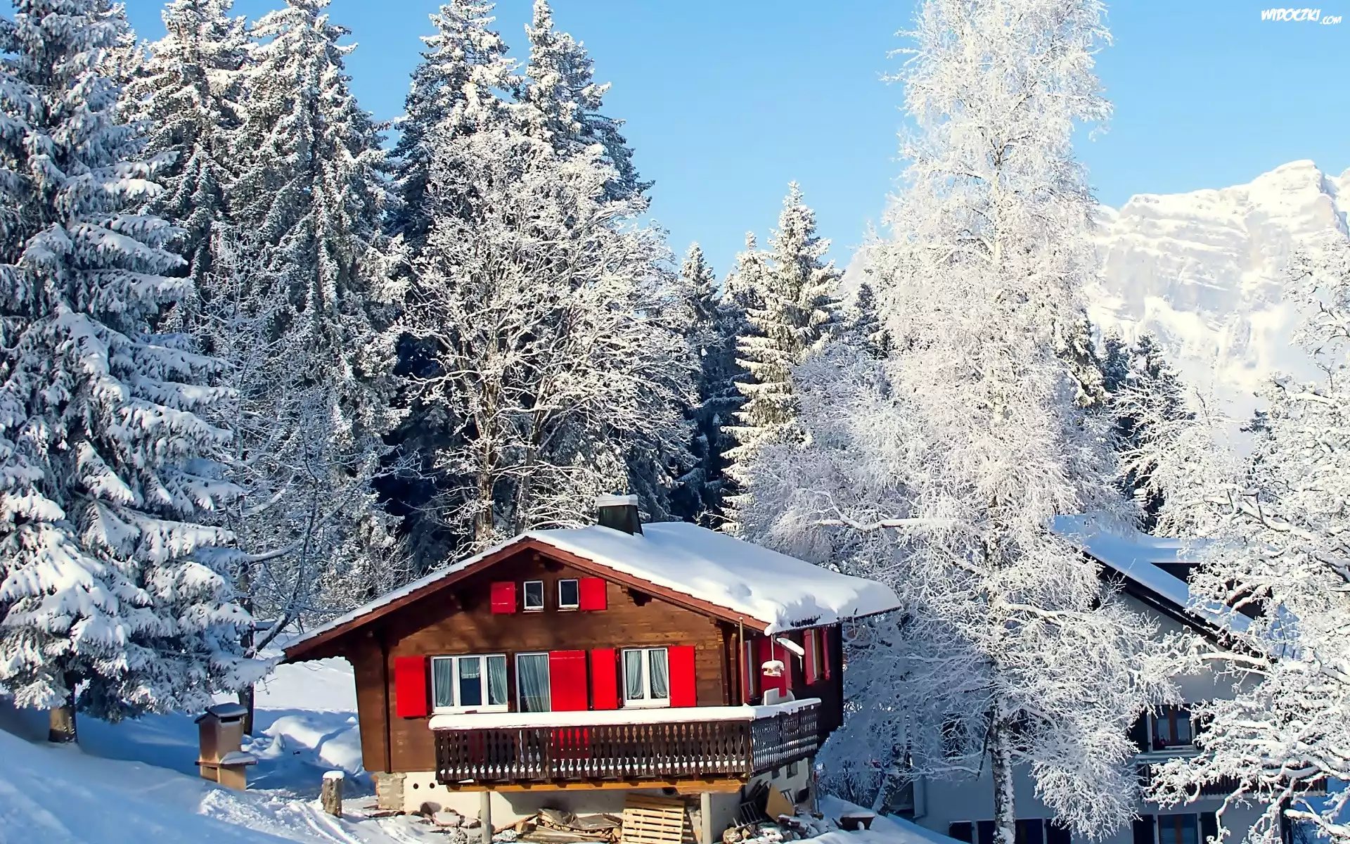 Zdjęcia, Zima, Śnieg, Las, Drzewa, Góry, Dom