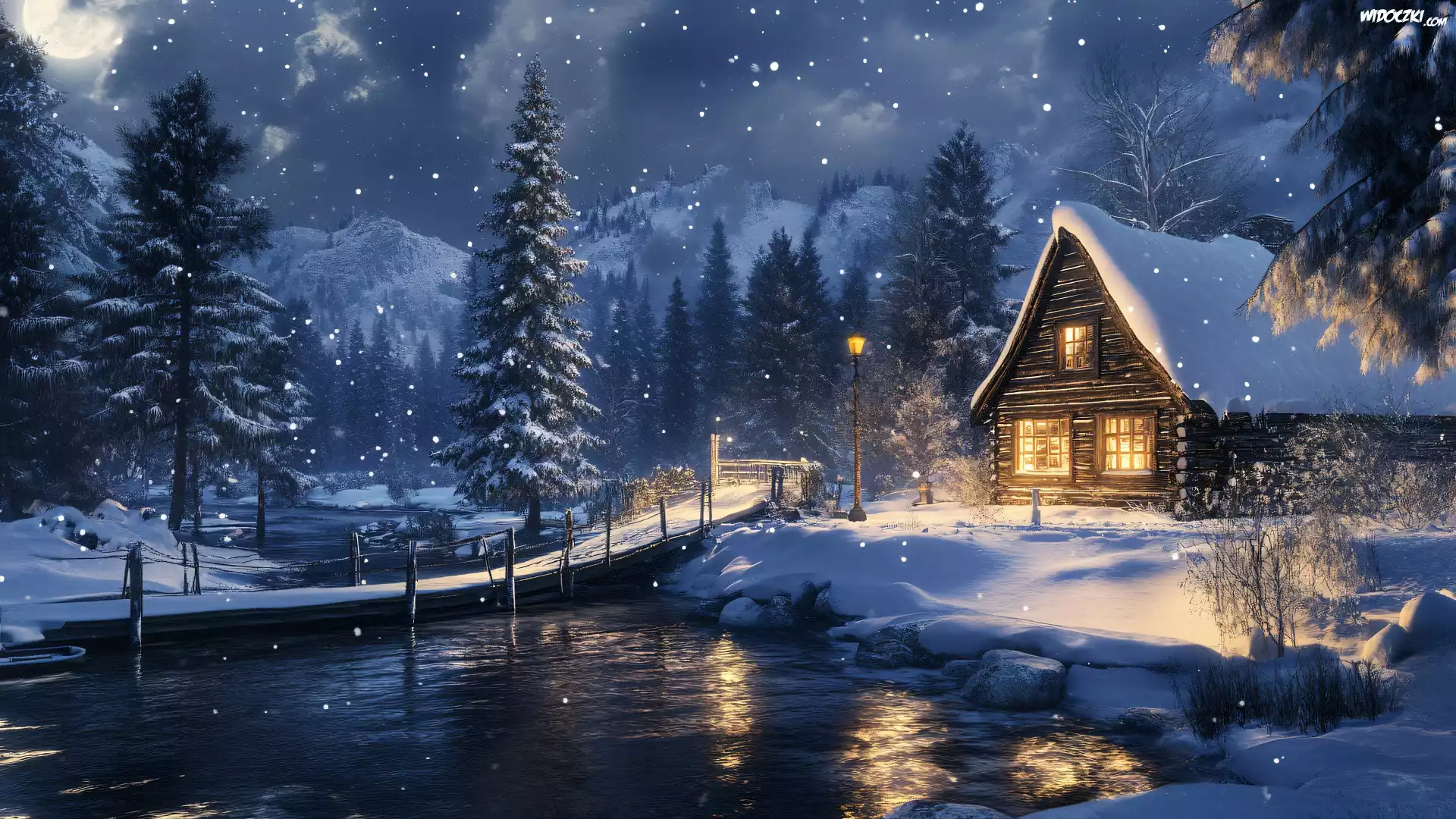 Zdjęcia, Zima, Dom, Latarnia, Rzeka, Most, Śnieg, Las, Drzewa, Góry, Noc
