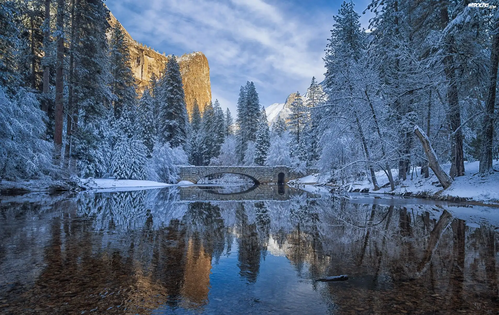 Zima, Rzeka, Most, Drzewa, Góry, Odbicie