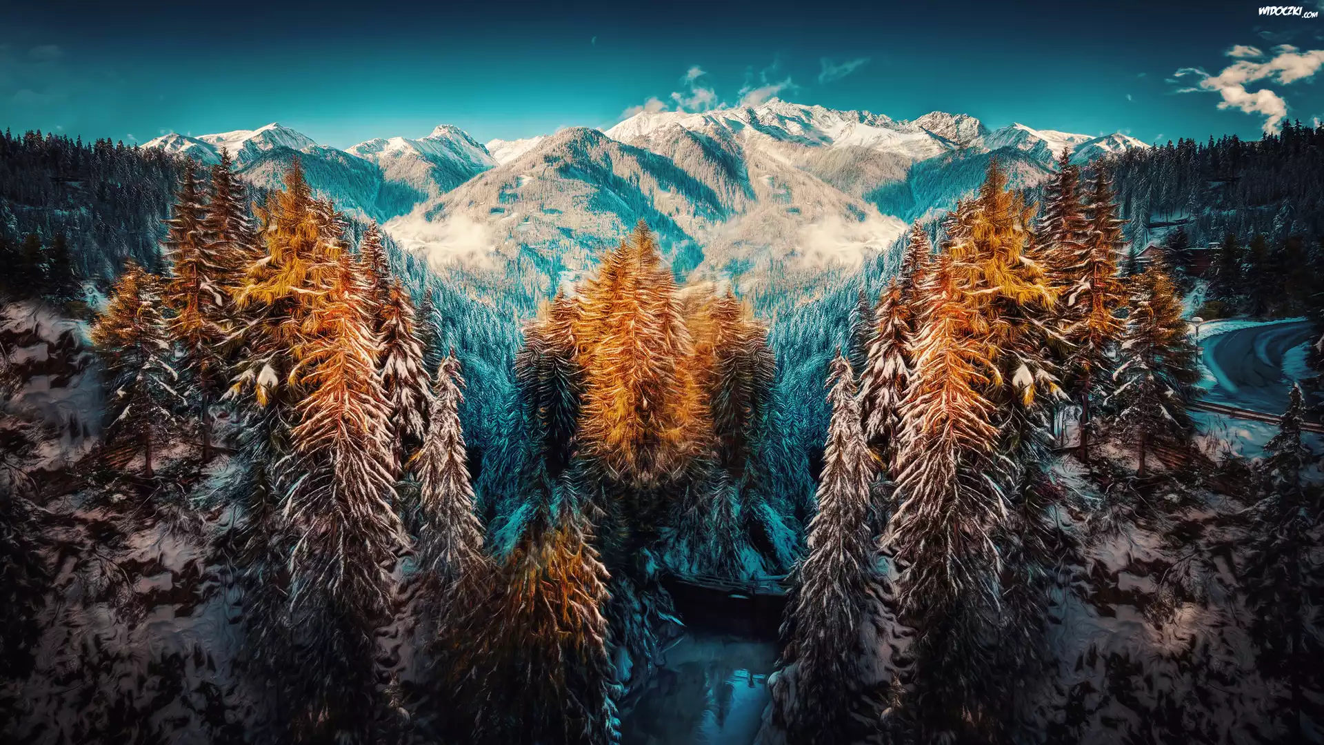 Góra Zima, Śnieg, Drzewa Góra, Rzeki Krajobraz, Zachód, Słońca, Śnieg Góra, Skały Góra Góra, Jeziora Góry, Choinki, Zima Skały, Zima Zima Drewniany mostek, Zima Zima, Miasto, Płatki, Śniegu Góra, Zachody Śłońca Góra