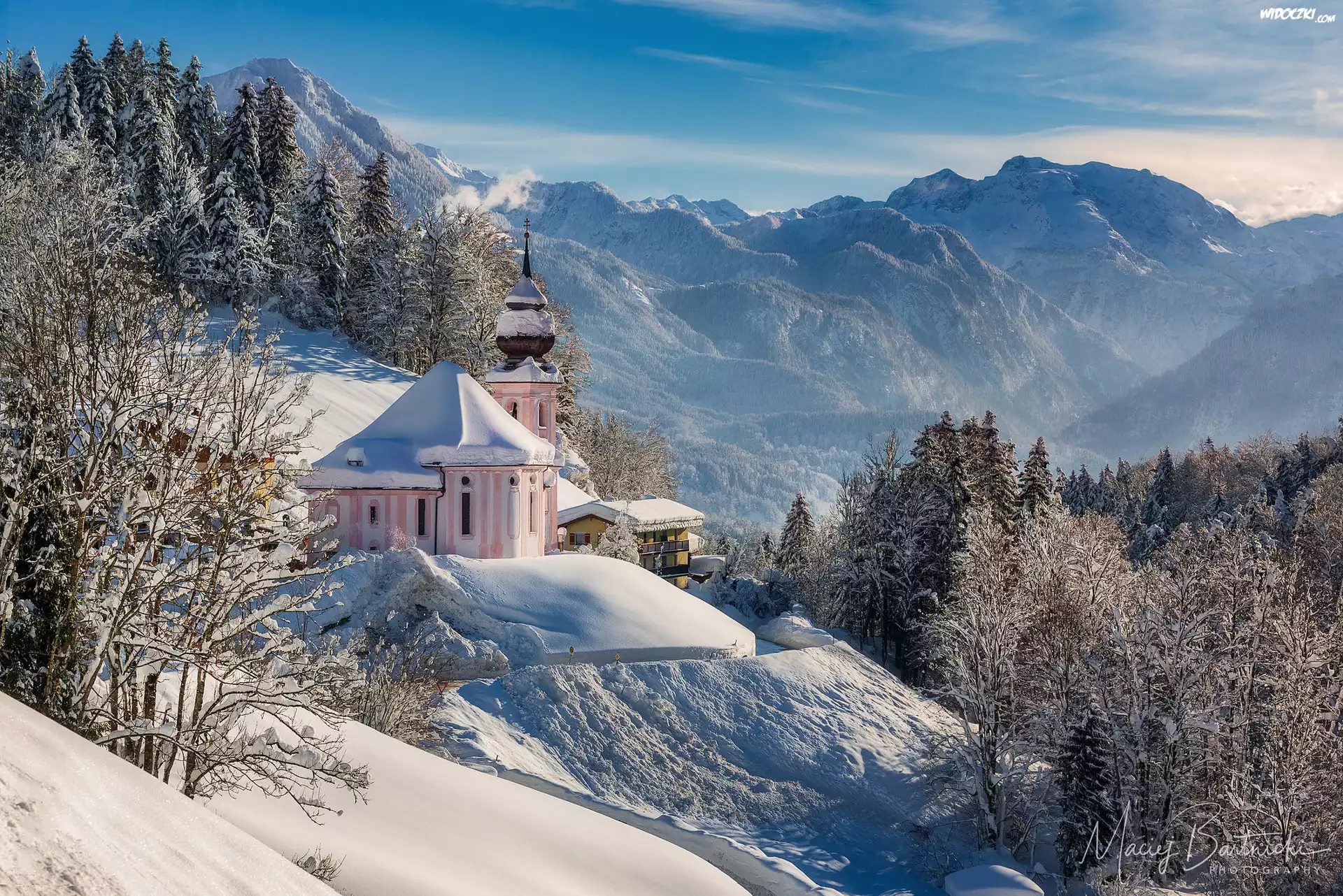 Góry, Alpy Salzburskie, Kościół, Drzewa, Zima, Sanktuarium Maria Gern, Berchtesgaden, Bawaria, Niemcy |