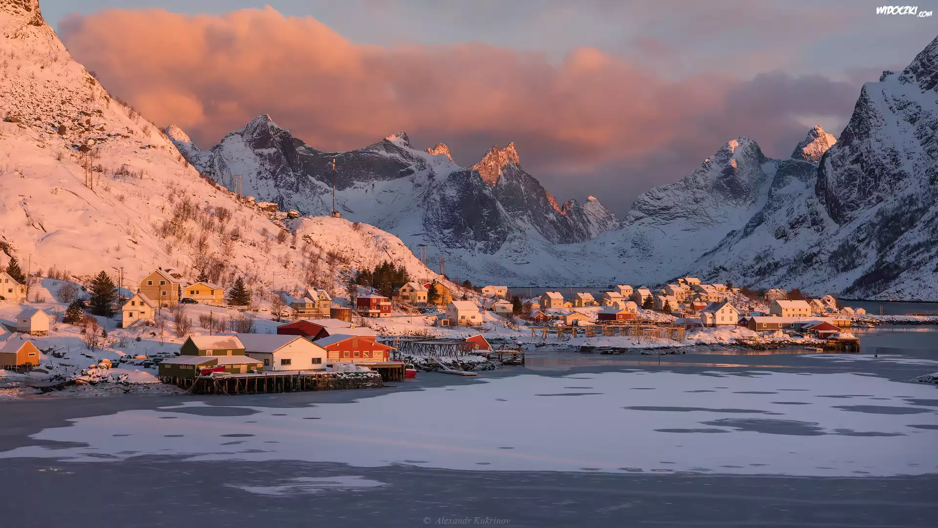 Zdjęcia, Góry, Zima, Wioska, Reine, Domy, Lofoty, Norwegia