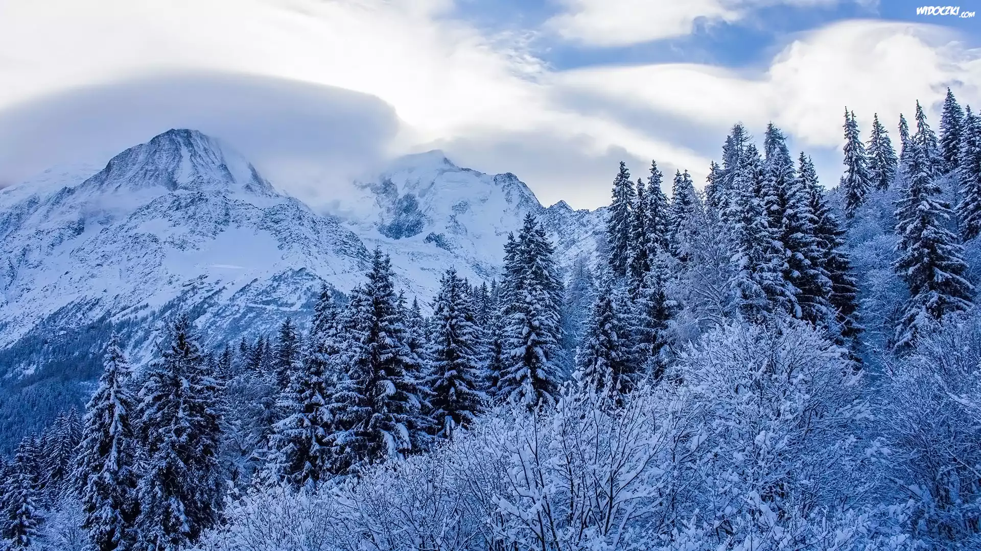Zdjęcia, Zima, Śnieg, Ośnieżone, Drzewa, Góry, Chmury