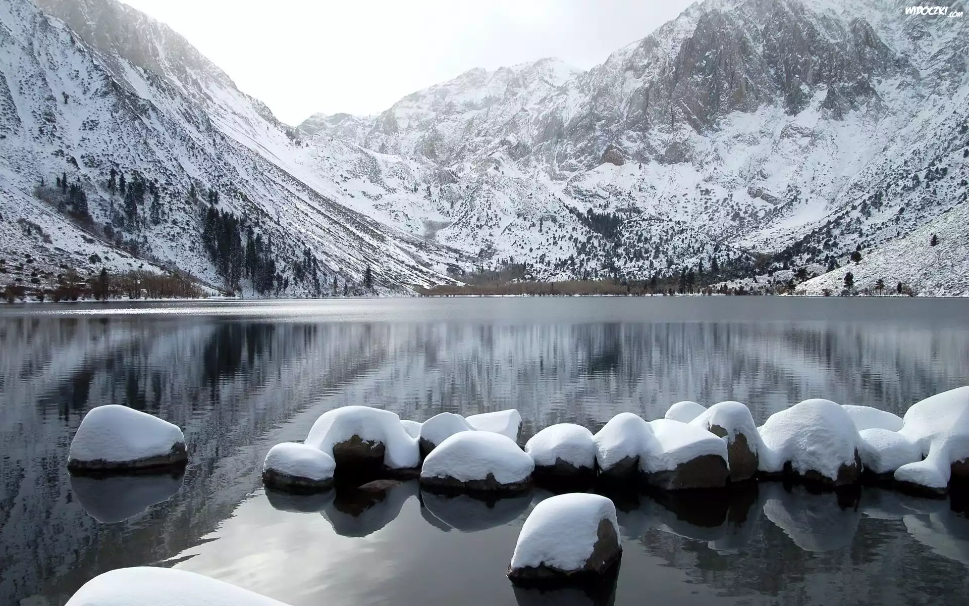 Zima, Jezioro, Ośnieżone, Góry, Kamienie