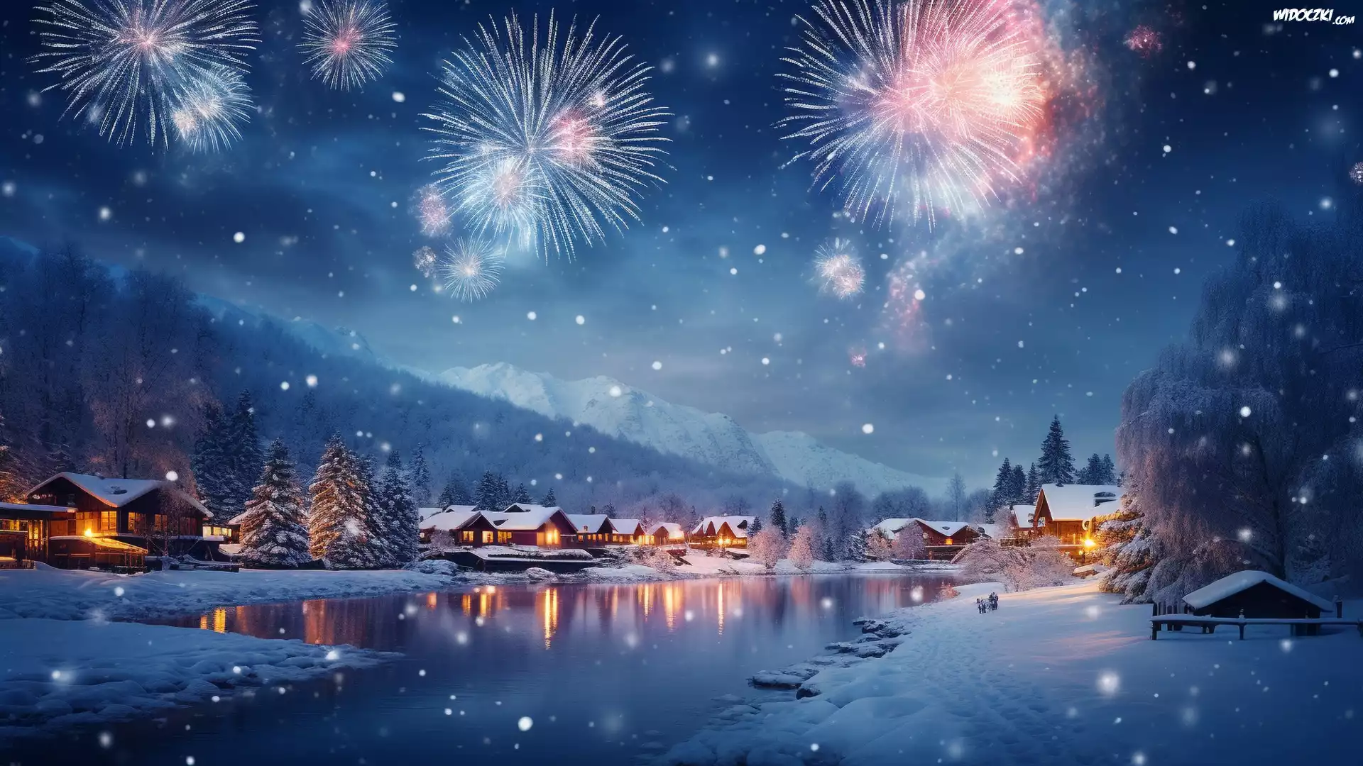 Zdjęcia, Zima, Śnieg, Fajerwerki, Rzeka, Domy, Światła, Góry, Las, Noc