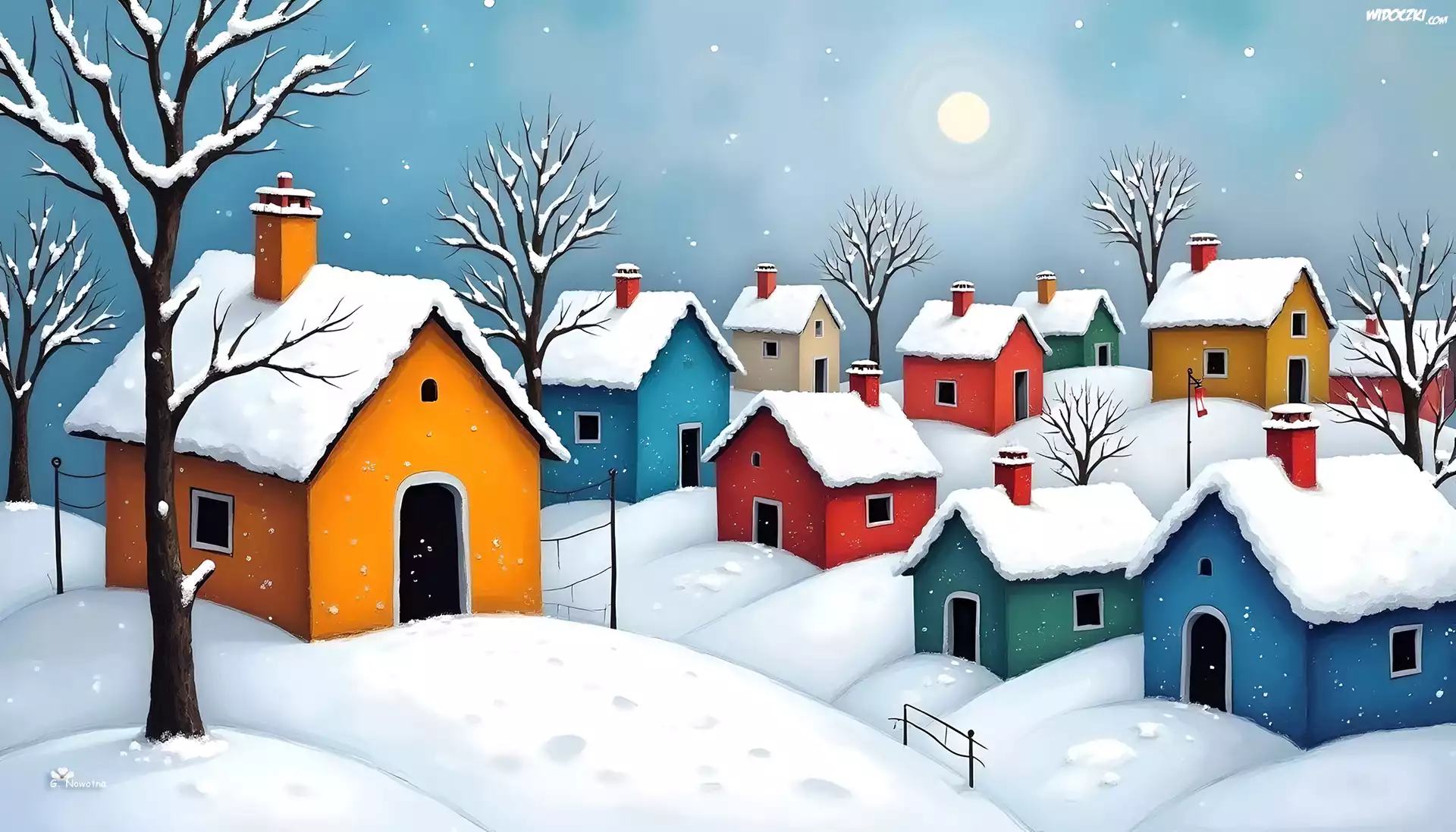 Zdjęcia, Ośnieżone, Domy, Drzewa, Zima, Śnieg, Grafika