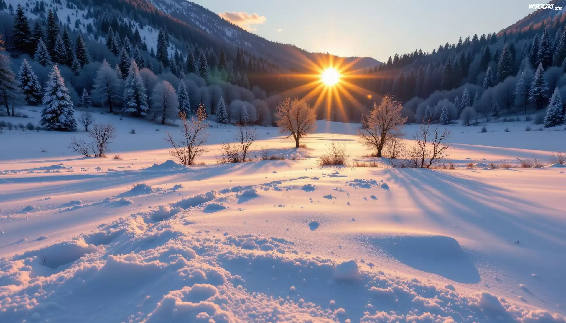 Zdjęcia, Zima, Pole, Drzewa, Las, Góry, Wschód słońca, Poranek, Grafika AI