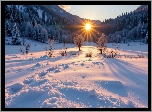Zima, Pole, Drzewa, Las, Góry, Wschód słońca, Poranek, Grafika AI