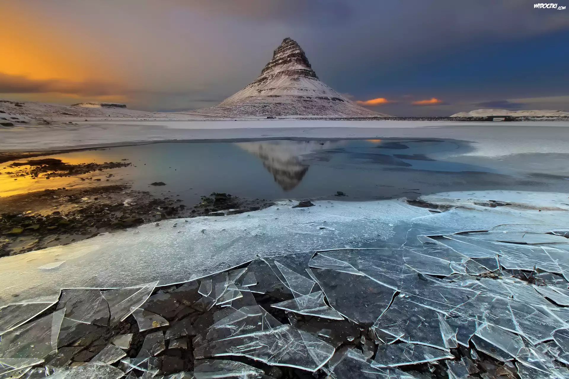 Zdjęcia, Islandia, Zima, Jezioro, Góra Kirkjufell, Pękająca, Kra