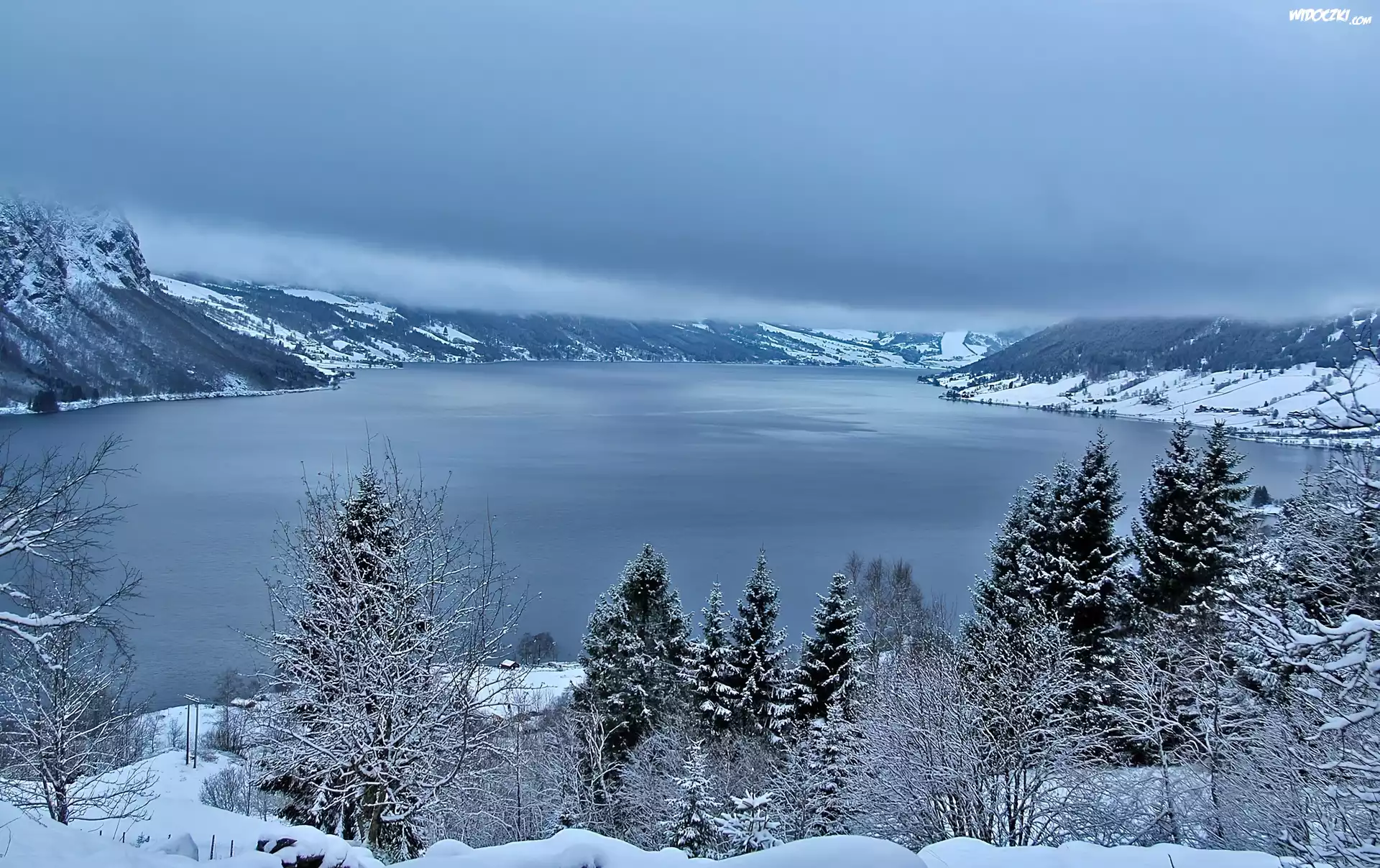 Zdjęcia, Zima Jezioro, Góry, Drzewa, Jolstravatnet, Norwegia