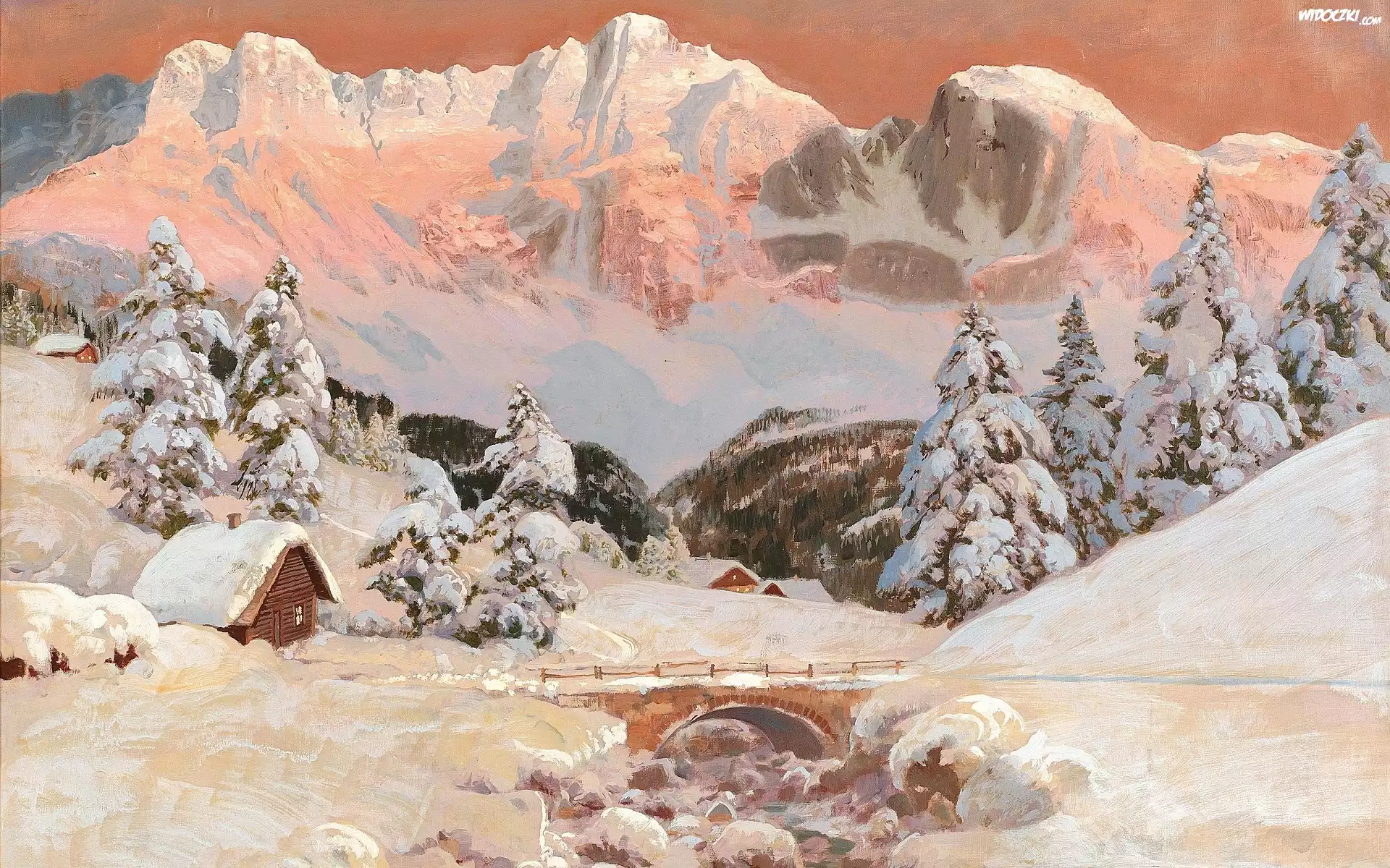 Zima, Austria, Góry Kaisergebirge, Rzeka, Most, Ośnieżone, Domy, Drzewa, Malarstwo, Obraz, Alois Arnegger |