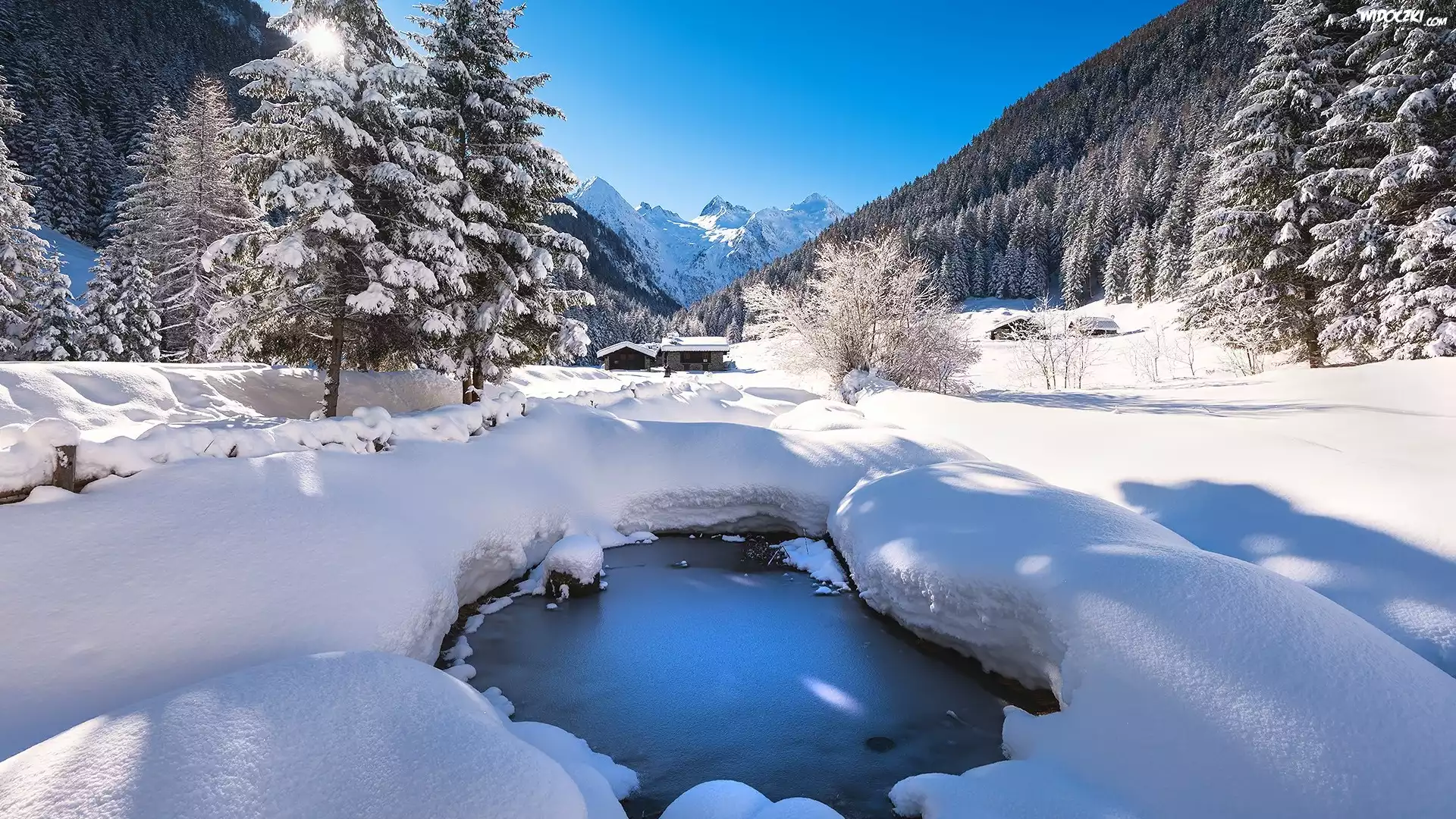 Zima, Góry, Las, Drzewa, Kałuża, Domy