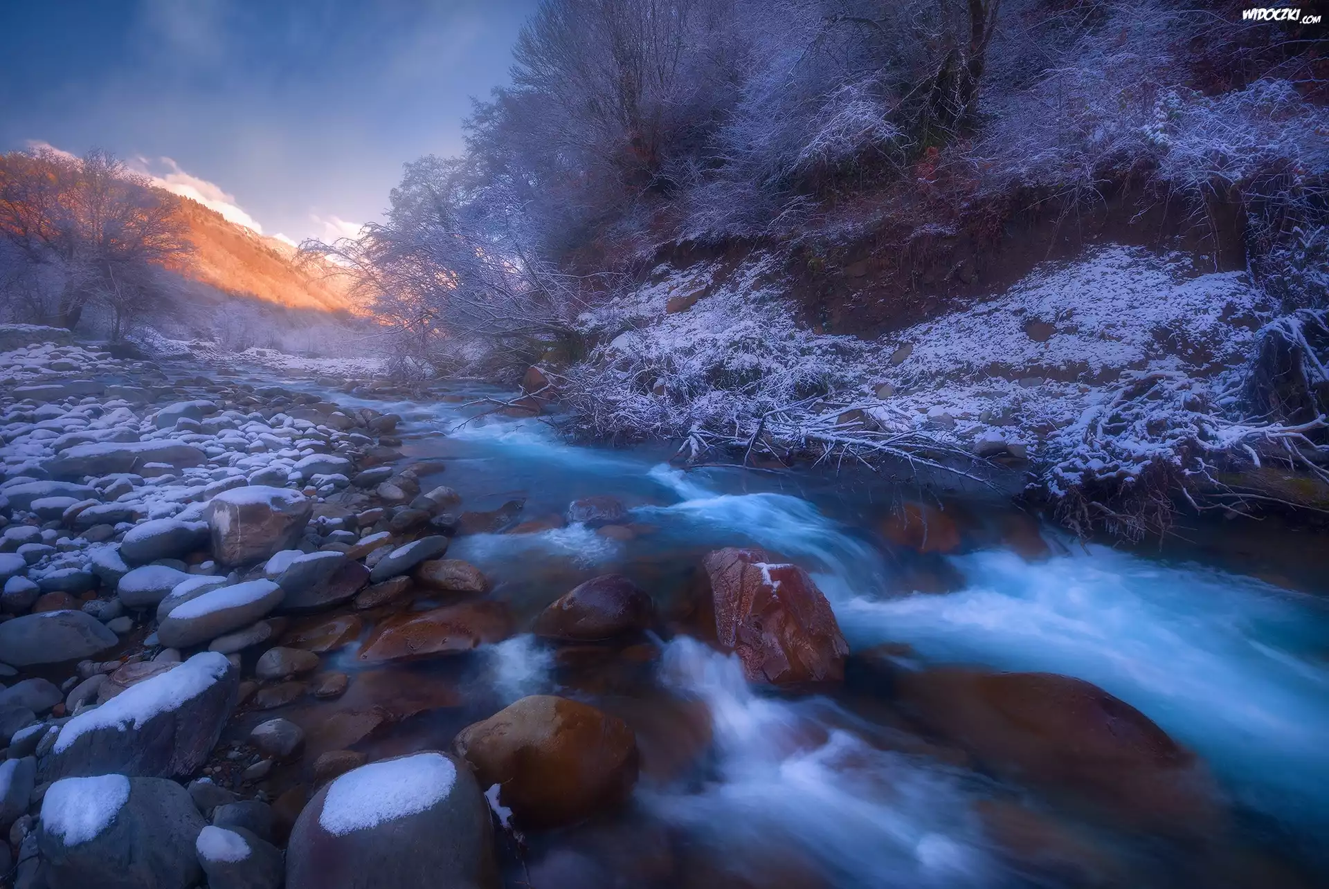 Zdjęcia, Zima, Drzewa, Kamienie, Rzeka