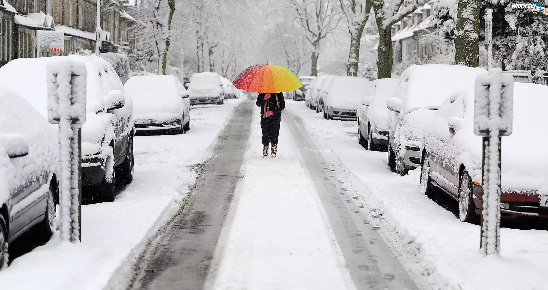 Zima, Ulica, Samochody, Kobieta, Kolorowa, Parasolka
