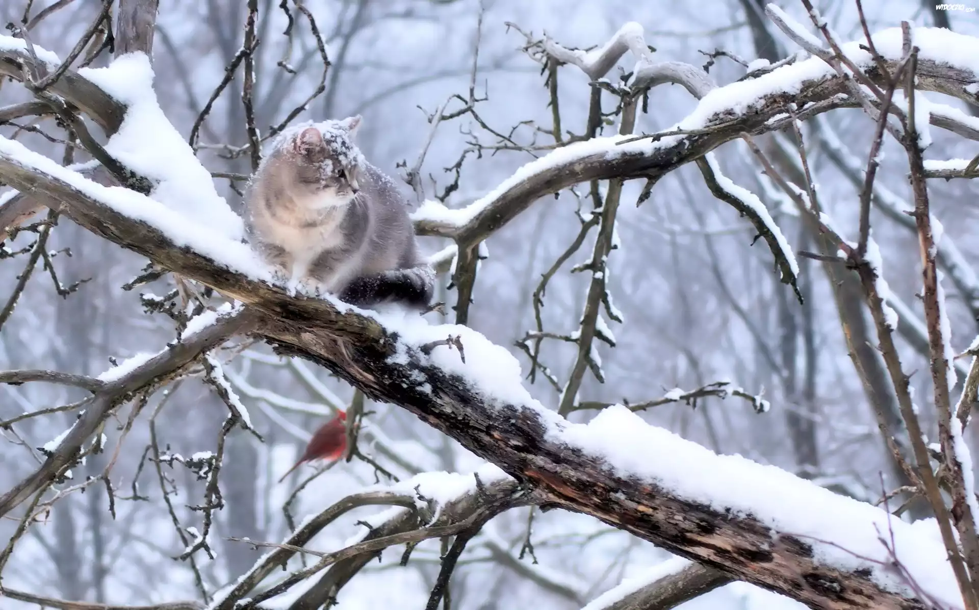 Zdjęcia, Zima, Ośnieżone, Gałęzie, Kot, Ptaszek