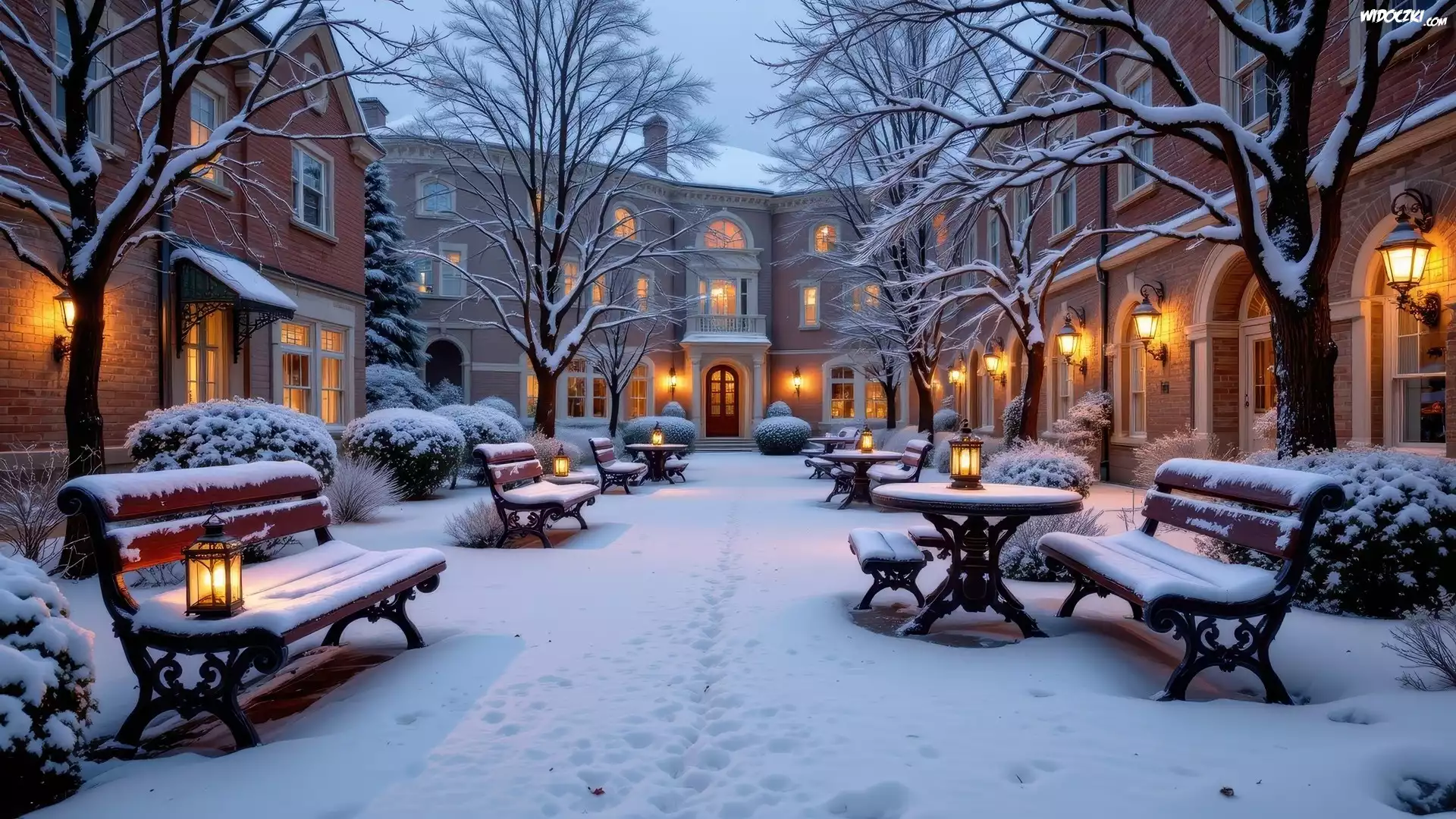 Zdjęcia, Zima, Domy, Ośnieżona, Alejka, Ławki, Drzewa, Krzewy, Rozświetlone, Lampiony