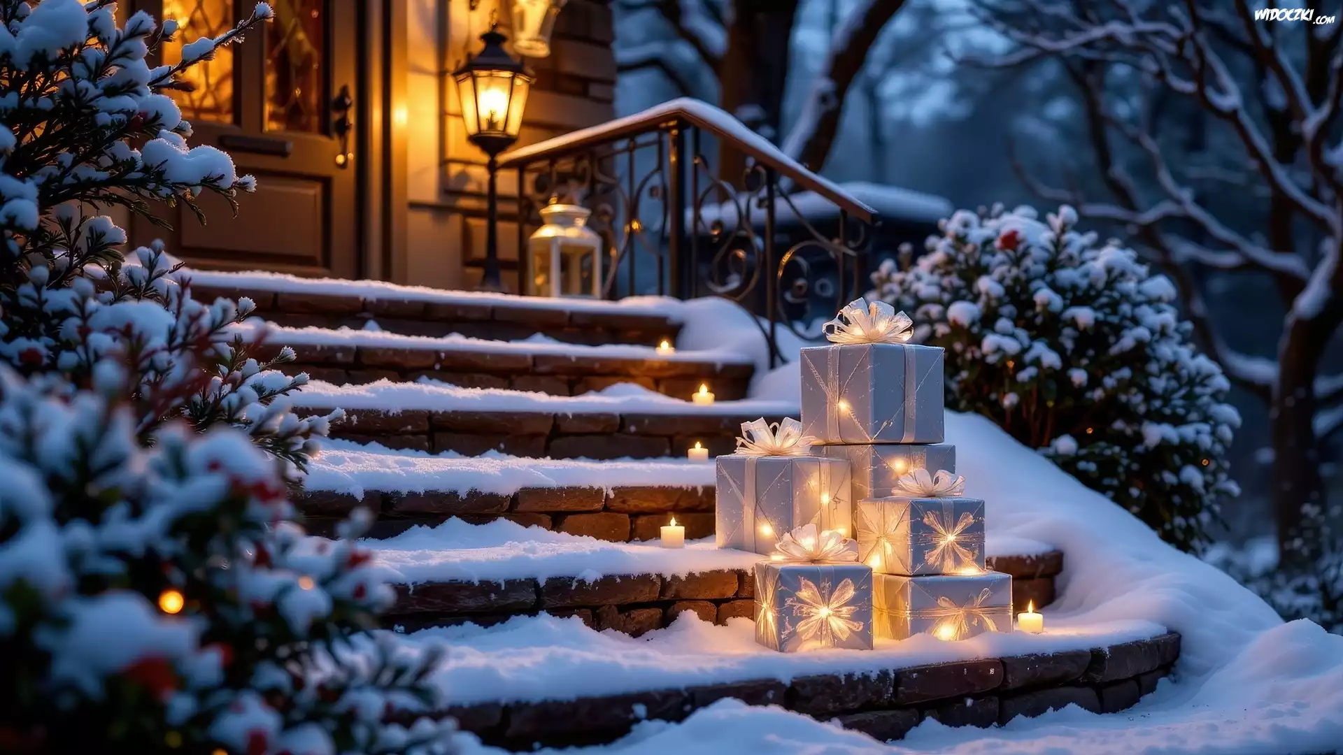 Zima, Dom, Schody, Śnieg, Prezenty, Ośnieżone, Krzewy, Świece, Latarnia
