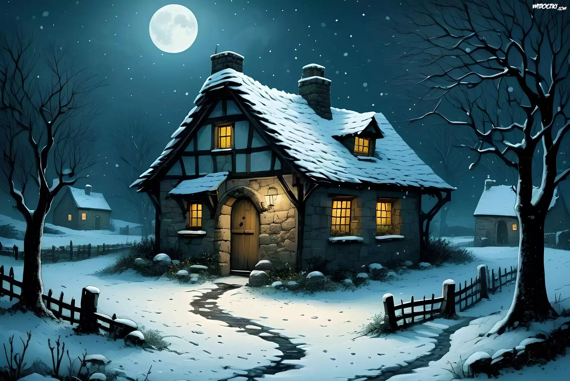 Zdjęcia, Zima, Domy, Drzewa, Śnieg, Ogrodzenie, Noc, Księżyc, Gwiazdy, Grafika