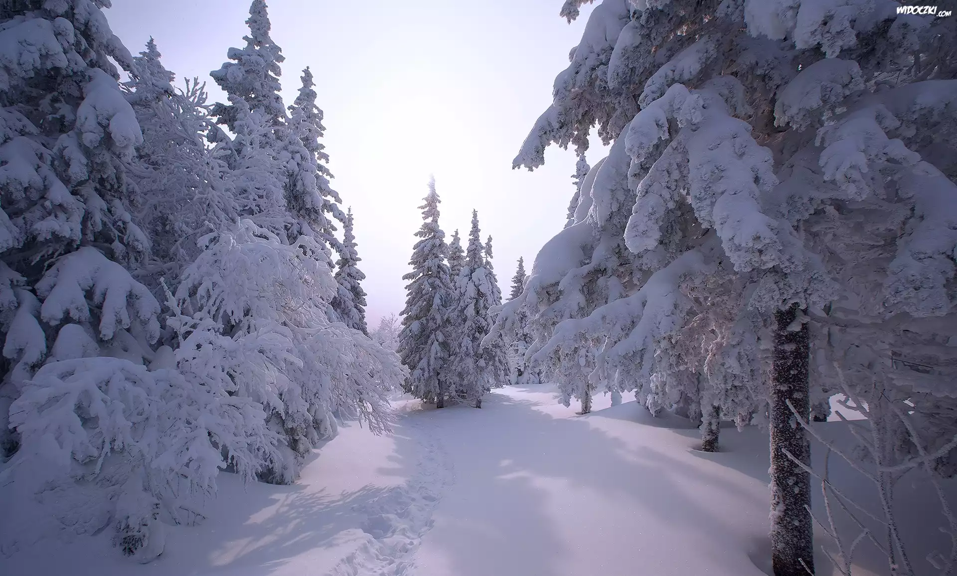 Zdjęcia, Zima, Ośnieżone, Drzewa, Las, Ślady, Śnieg