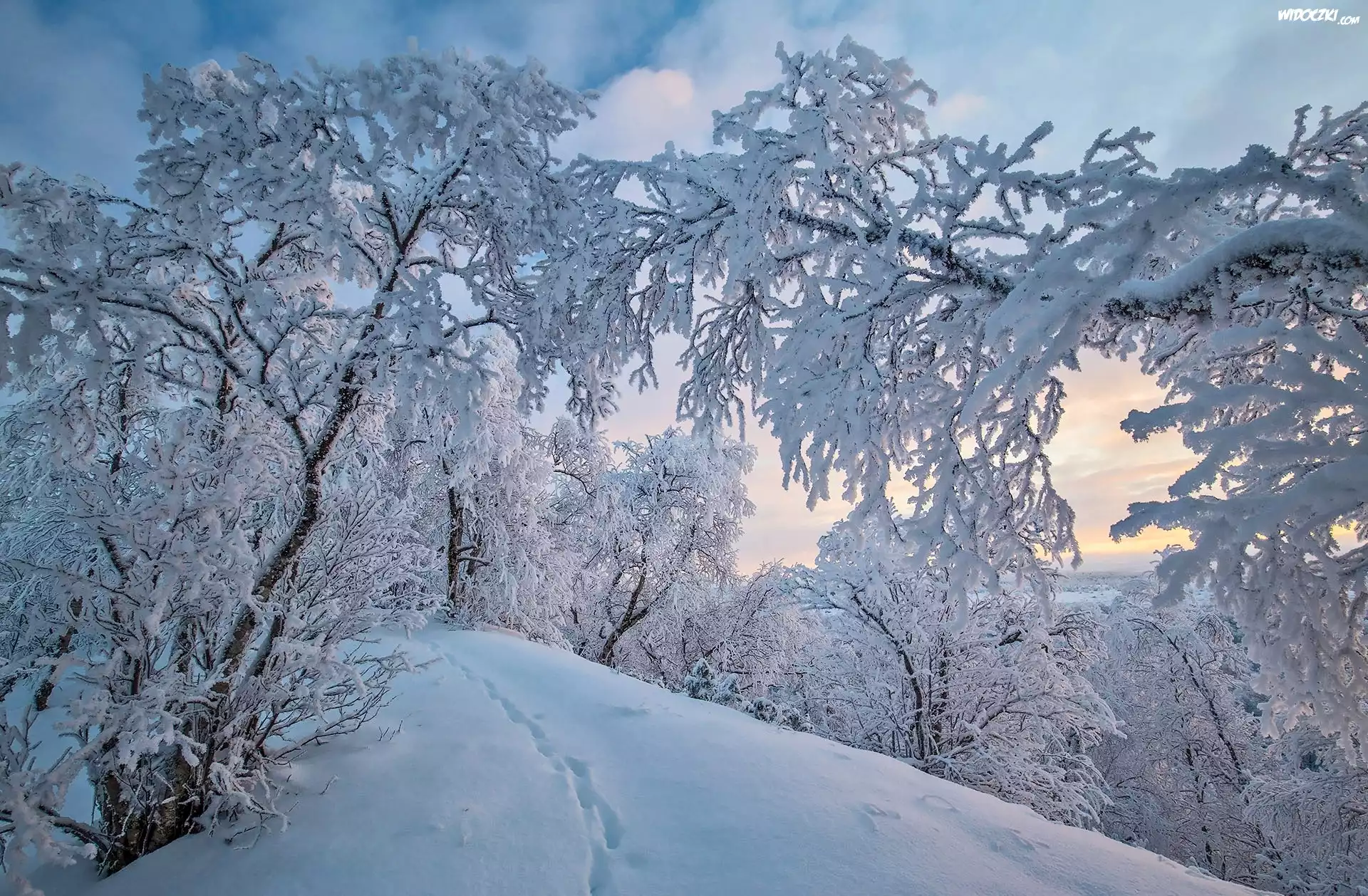 Zdjęcia, Zima, Ośnieżone, Drzewa, Ślady, Pagórek