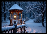 Zdjęcia, Zima, Noc, Park, Altana, Śnieg, Ogrodzenie, Lampion, Ośnieżone, Drzewa