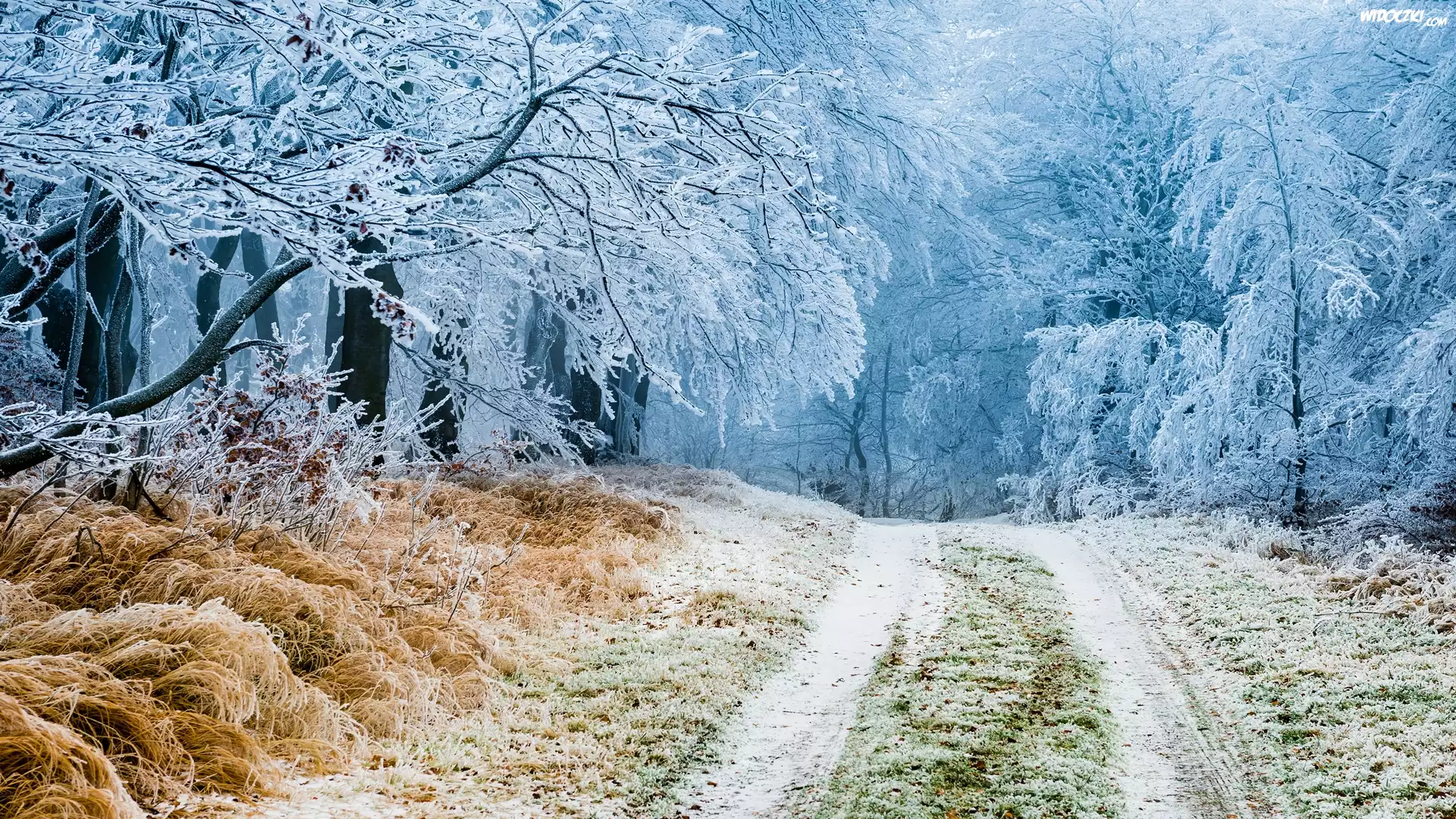 Zdj臋cia, Zima, Droga, Las, Drzewa