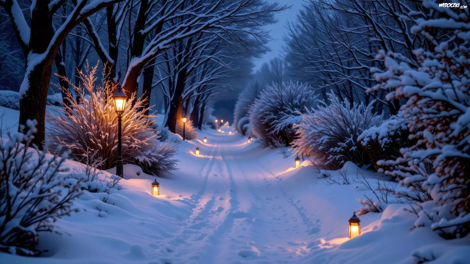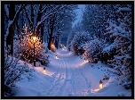 Zima, Zaśnieżona, Droga, Latarnie, Lampiony, Ośnieżone, Drzewa, Krzewy, Las, AI