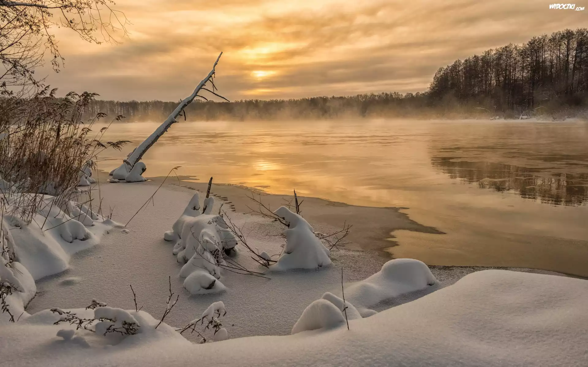 Zdjęcia, Zima, Jezioro, Śnieg, Las, Mgła