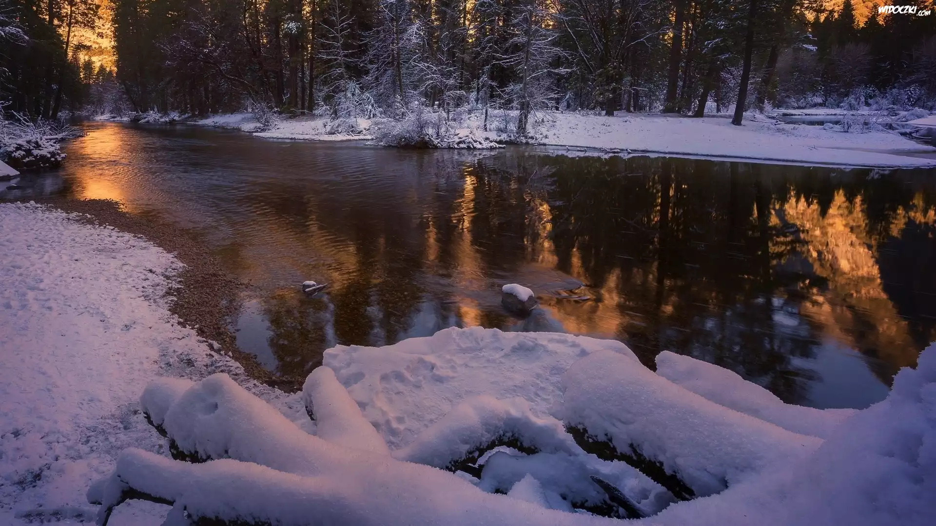 Zdjęcia, Zima, Rzeka, Śnieg, Las, Drzewa
