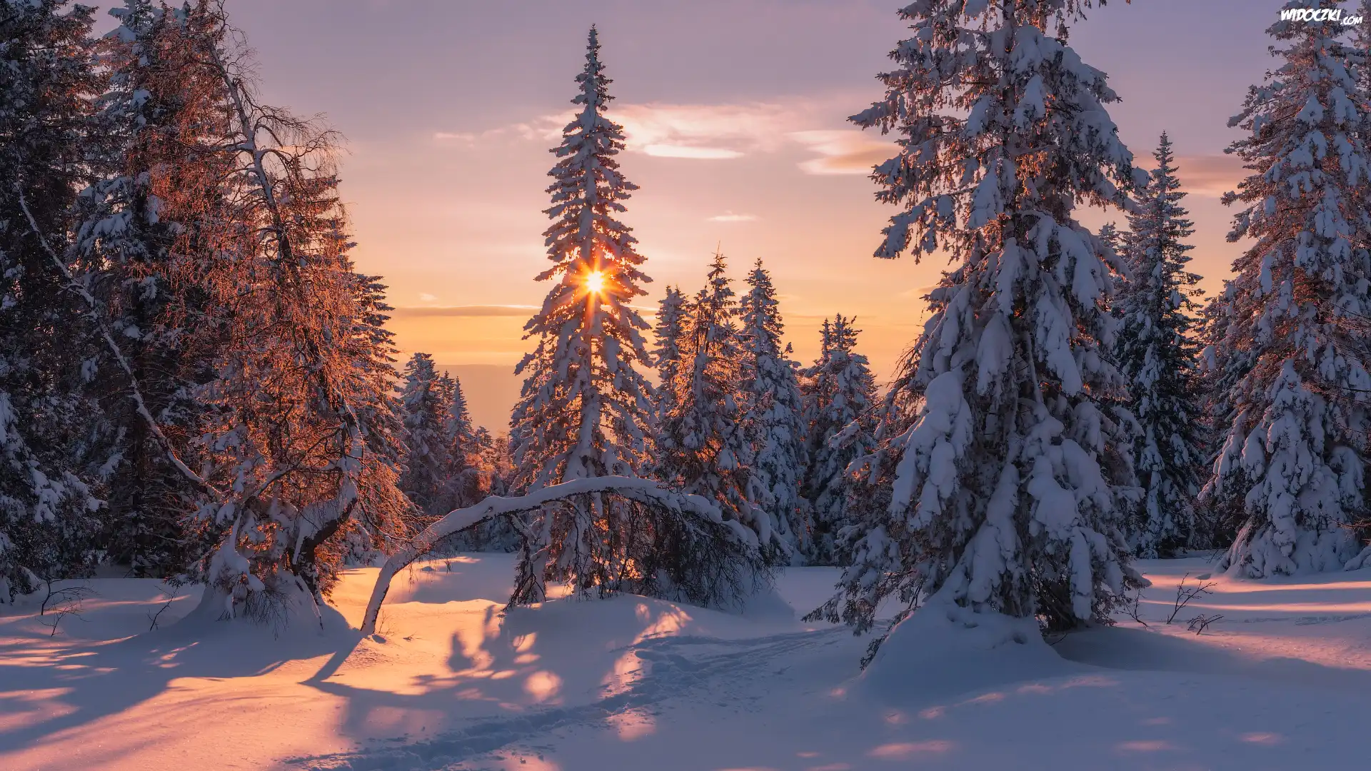 Zdjęcia, Zima, Śnieg, Promienie słońca, Las, Świerki