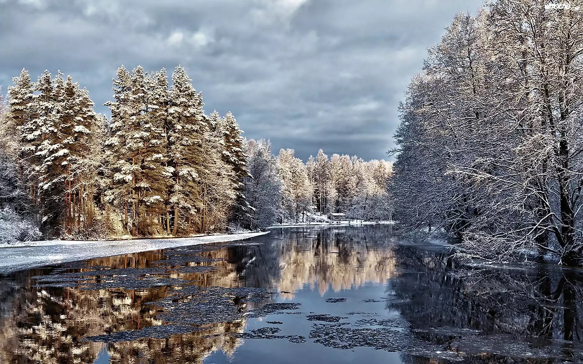 Zima, Åšnieg, Rzeka, Las, Drzewa
