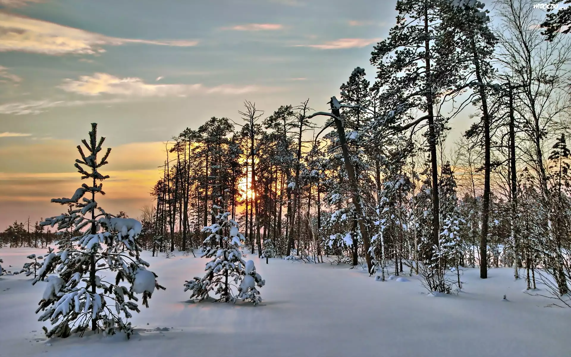 Zima, Śnieg, Zachód Słońca, Las, Drzewa