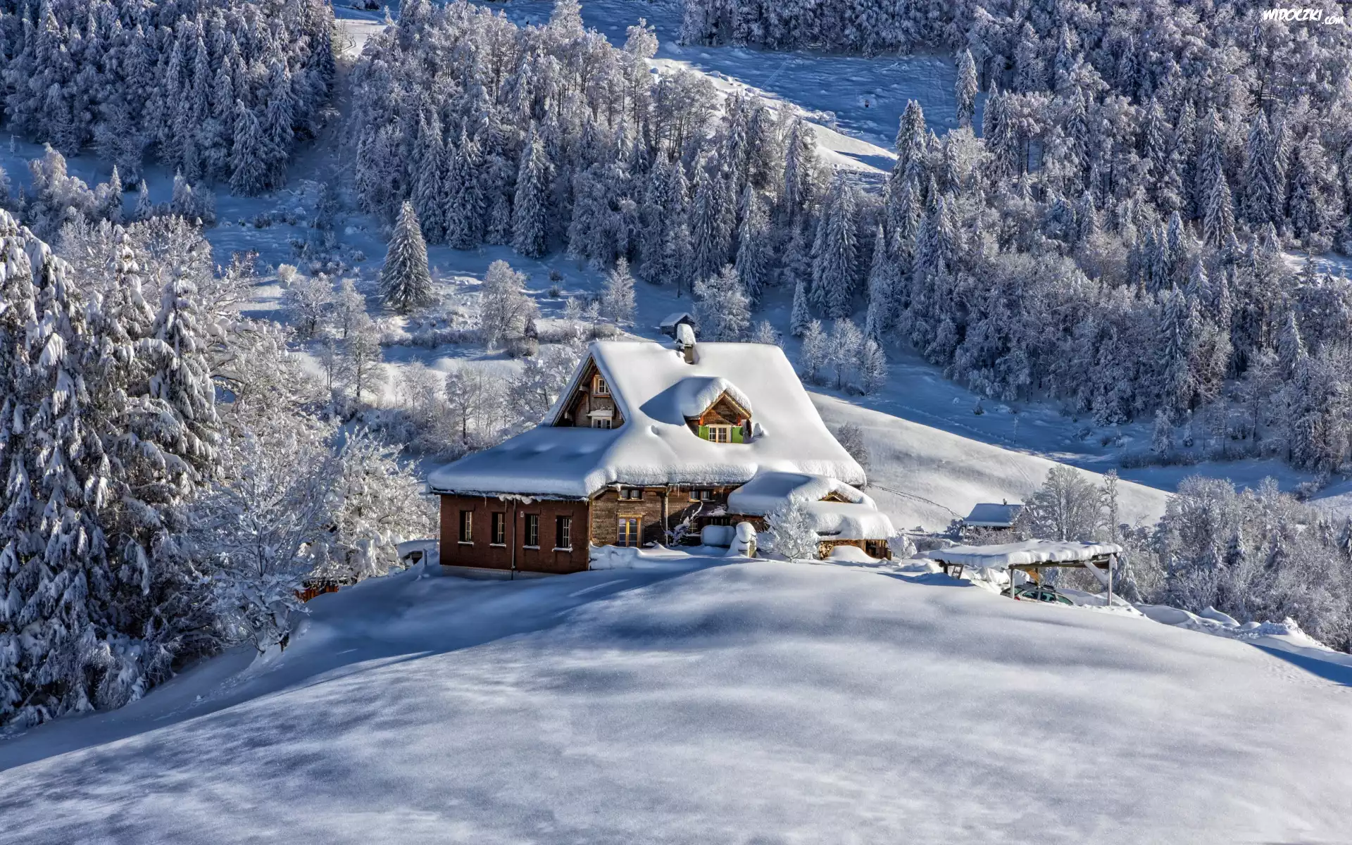 Zdjęcia, Zima, Śnieg, Drzewa, Góry, Lasy, Dom