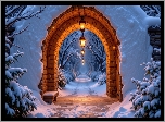 Zima, Noc, Ośnieżona, Droga, Brama, Łuk, Latarnie, Drzewa, AI