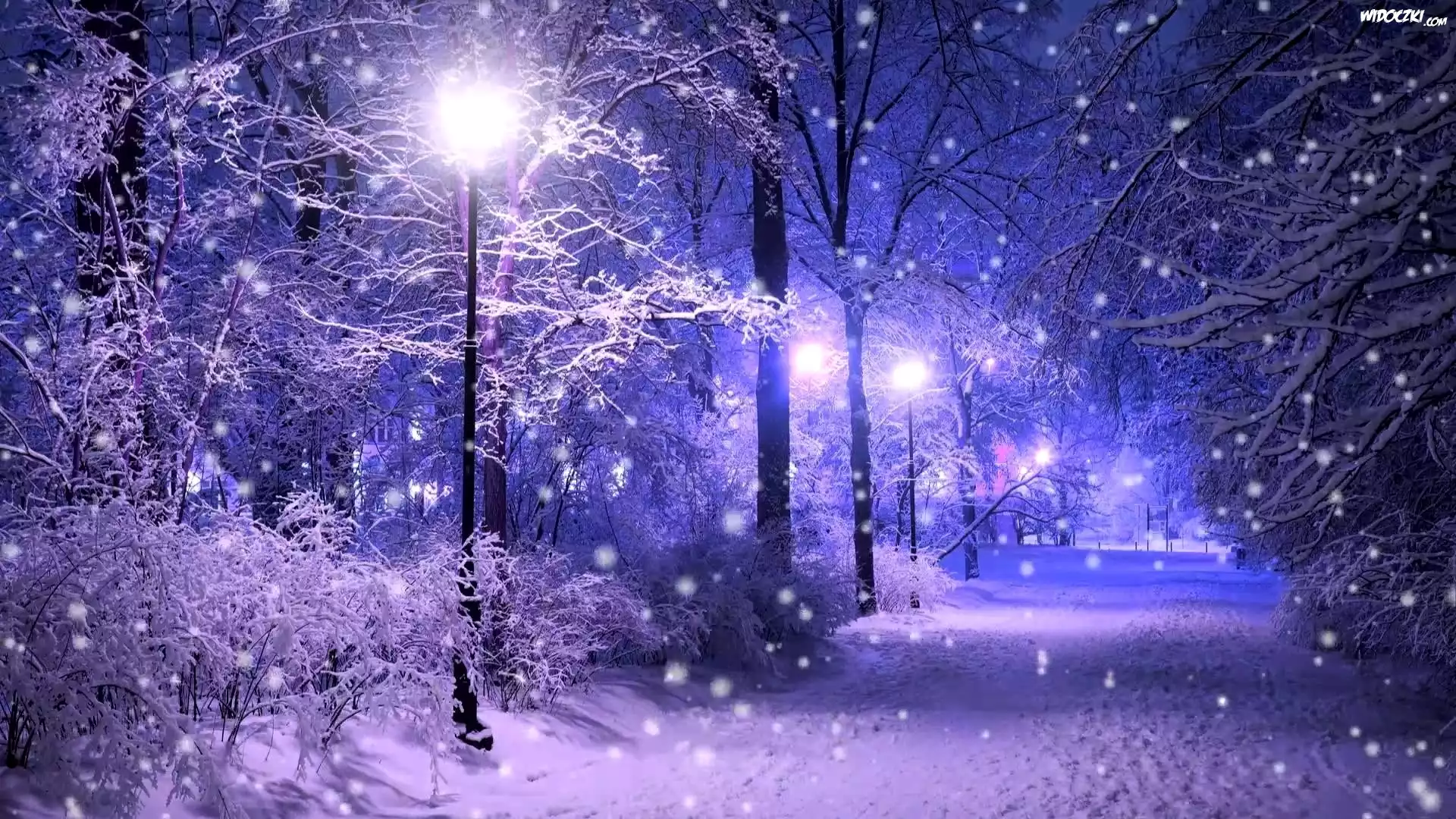 Zdjęcia, Zima, Park, Noc, Latarnie, Śnieg